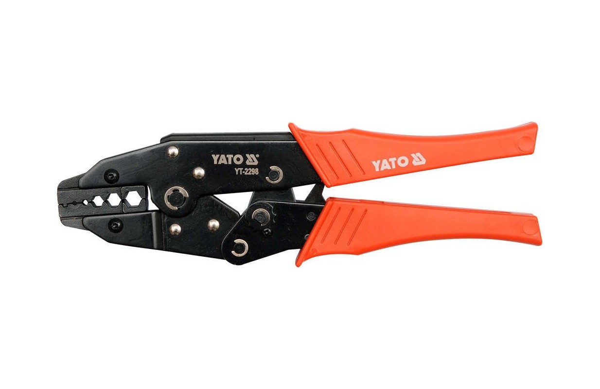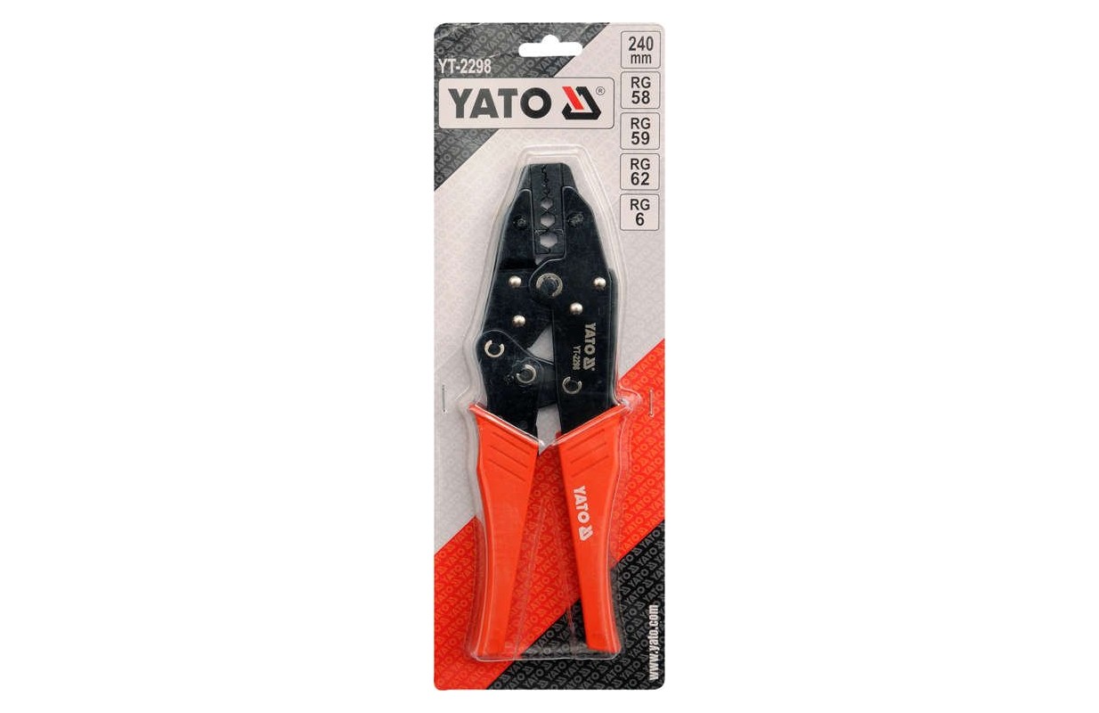 Клещи YT-2298 для обжима антенных разъемов, с черненой поверхностью, защищающей от коррозии, и с пластиковыми крышками рукояток. Храповой механизм обеспечивает быстрый и точный зажим без приложения чрезмерной силы.