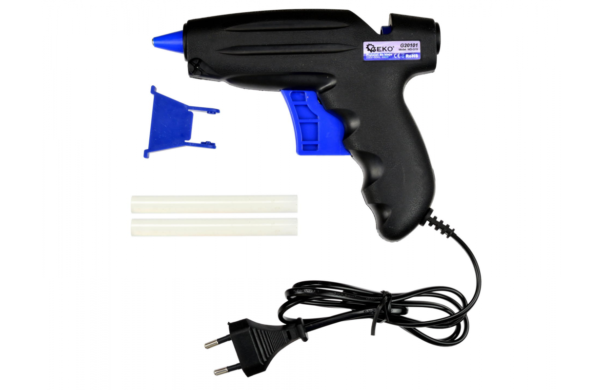 Пистолет для горячего клея WD-19. Устройство предназначено для склеивания пластмасс, стекла, фарфора, тканей, дерева, рубероида и т.д. (Не использовать для материалов, не устойчивых к высоким температурам). Пистолет имеет мощность 200 Вт , что значительно сокращает время нагрева. Изготовлен из прочного пластика, отличается высокой устойчивостью к механическим повреждениям