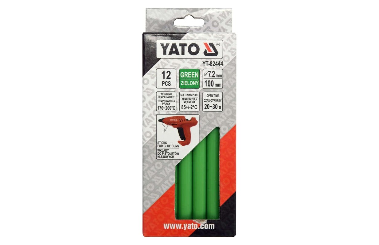 Зеленый термоклей YATO диаметром 7,2 мм и длиной 100 мм . В упаковке 12 штук клеевых стержней.