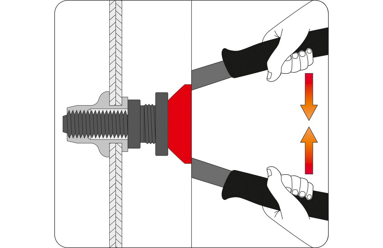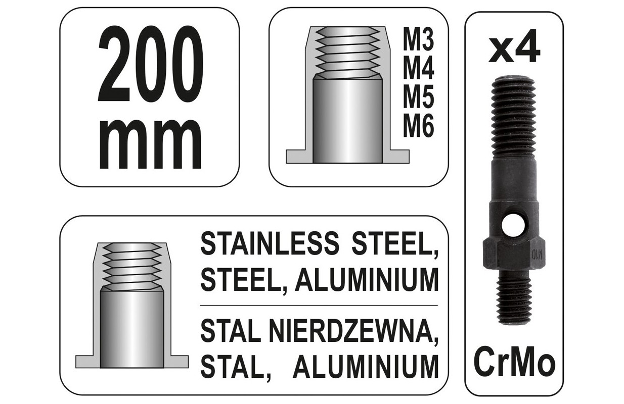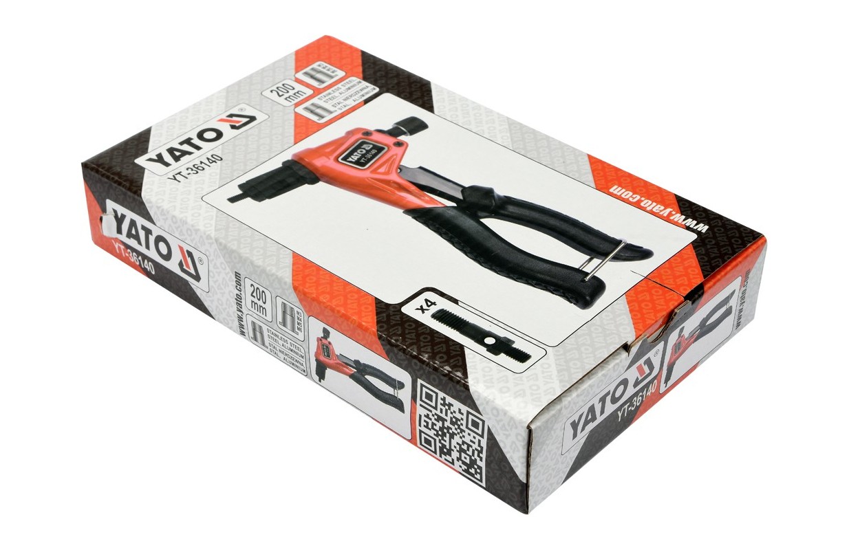 Ручной заклепочник для нитридных заклепок YATO YT-36140 M3-M6. Заклепочный станок для изготовления соединений материалов с использованием нитрида. Соединяет материалы с помощью втулки с внутренней резьбой. Это позволяет прикручивать дополнительные компоненты с помощью металлических винтов или шурупов. Головки размеров: M3, M4, M5, M6. Изготовлены из хромомолибденовой инструментальной стали CrMo. Рукоятки покрыты нескользящей резиновой накладкой.