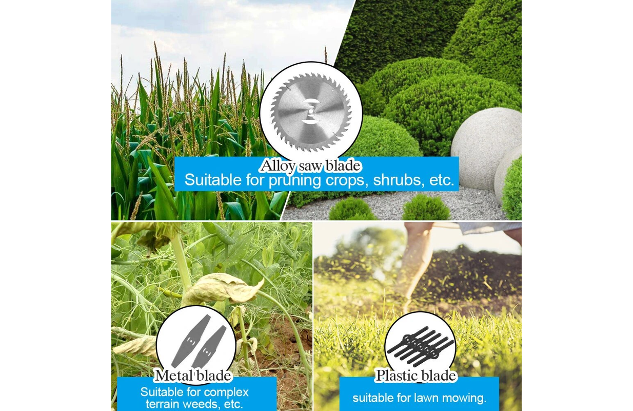 ● Три лезвия Пластиковые диски, металлические диски, пильные диски из сплава для удовлетворения потребностей различных сценариев ● Сильная мощность Отсутствие заклинивания, легкое кошение на большой площади ● Мощный двигатель с двумя подшипниками Передний и задний двойные подшипники имеют высокую мощность, а кошение более плавное, высокотемпературная эмалированная проволока 220, устойчивость к высоким температурам и длительный срок службы ● Эргономичная и удобная ручка Мягкое резиновое покрытие не имеет технологии заусенцев, его удобно держать и очень удобно использовать ● Регулируемая под разными углами насадка Регулировка под разными углами, подходит для разных сцен. Стрижка, обрезка и озеленение. Он удобнее в использовании, и удобнее увеличивать кнопку регулировки угла ● Дизайн травы Anti Card Прощай с картой ситуацию с травой, пользуйтесь эффективнее, подальше от неприятностей ● Телескопическая труба Простота выполнения