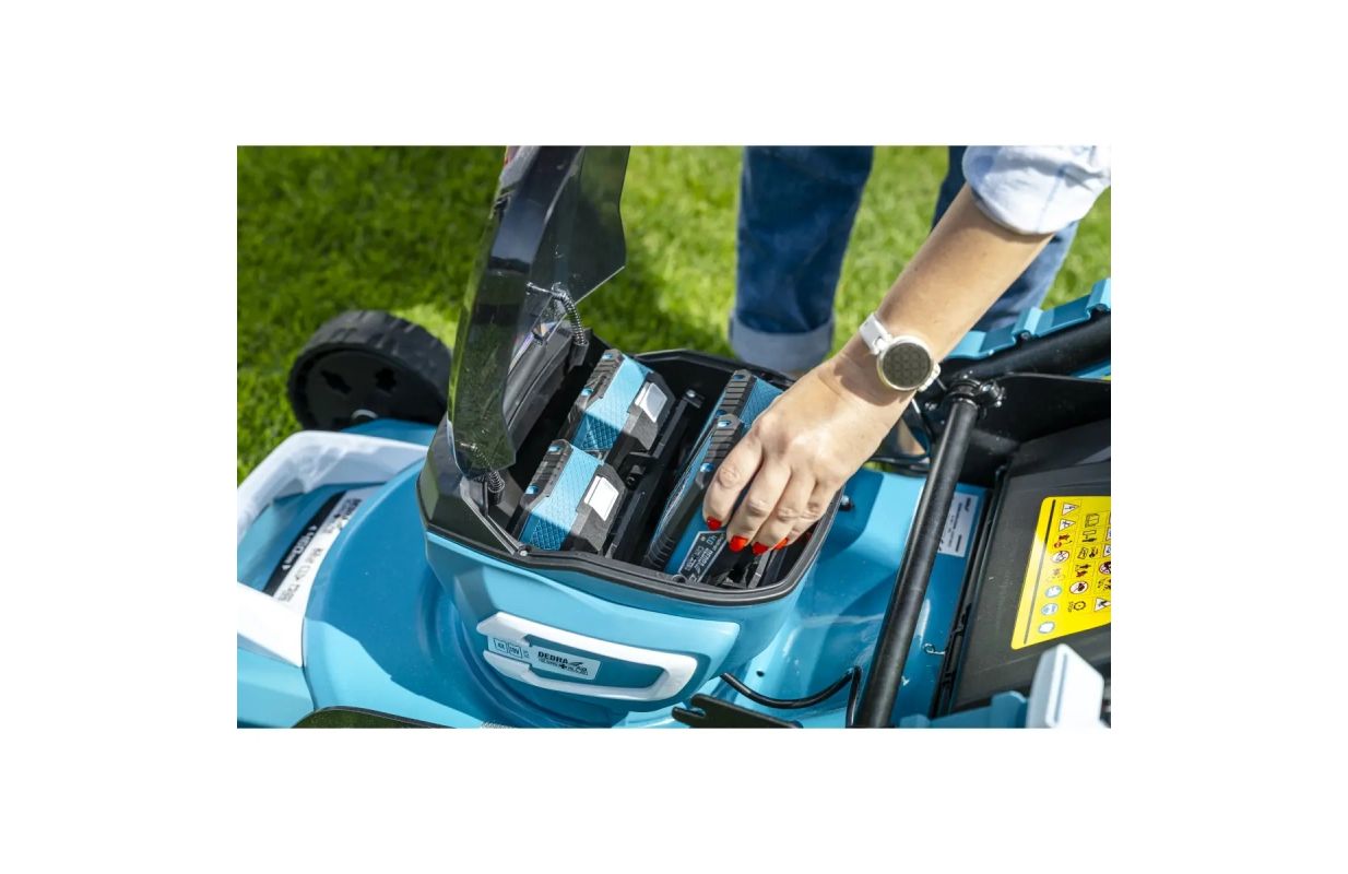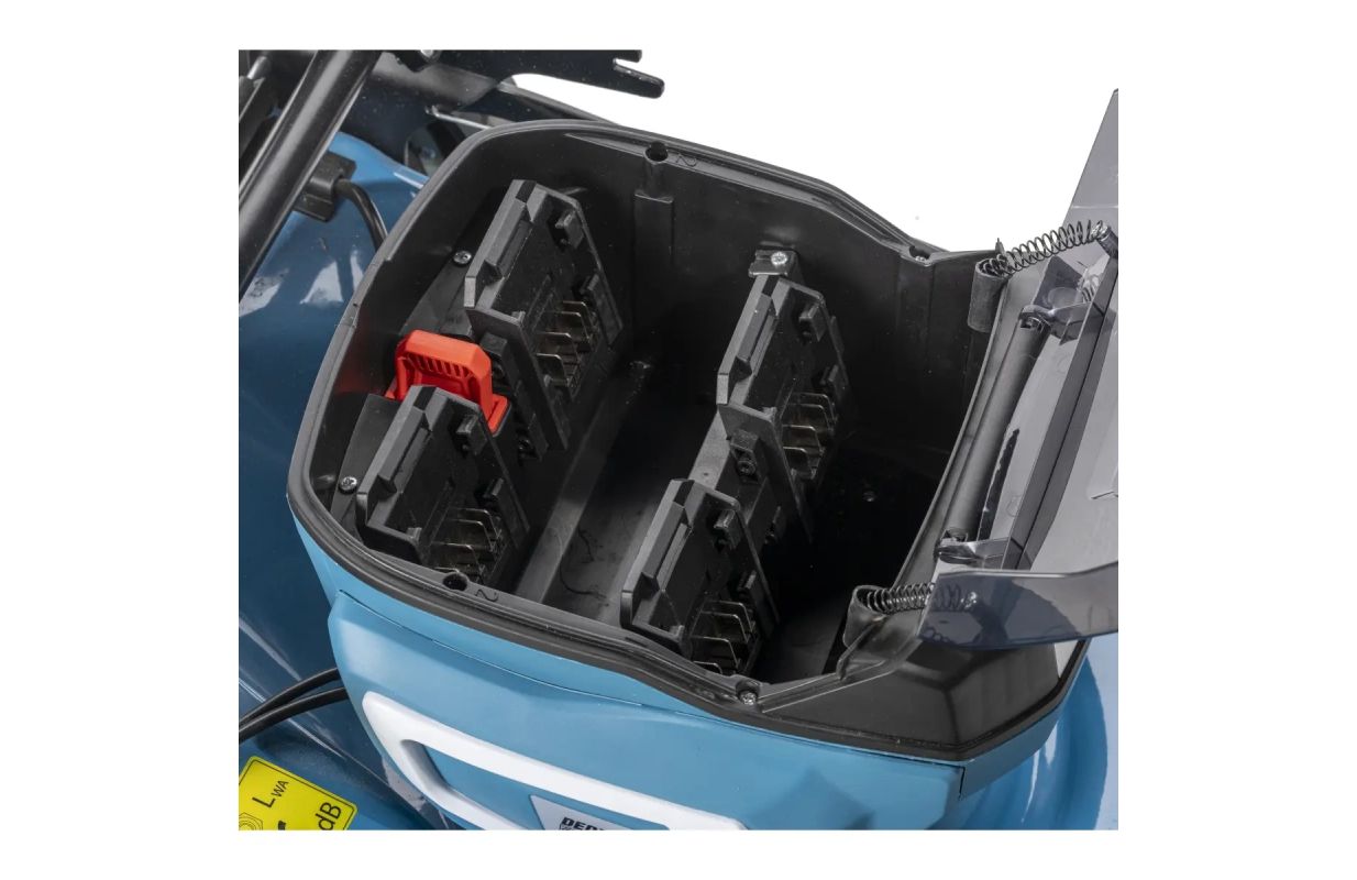 Газонокосилка оснащена инновационной системой автоматического переключения аккумуляторов. Благодаря четырем отсекам для аккумуляторов, устройство автоматически переключается между парами аккумуляторов, что позволяет работать без перерывов в течение длительного времени. Эта функциональность повышает комфорт эксплуатации, исключая необходимость частой остановки для замены аккумуляторов.