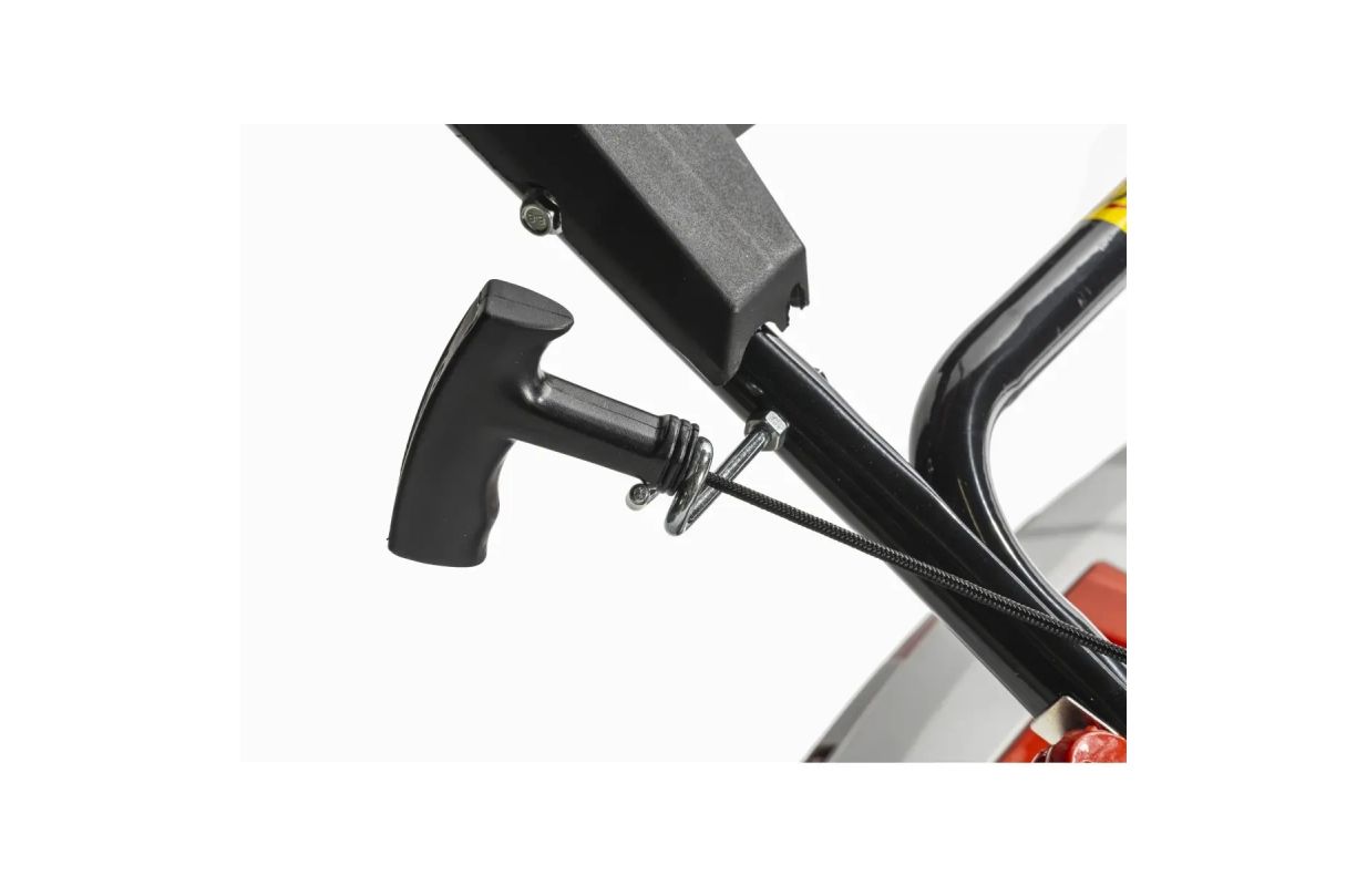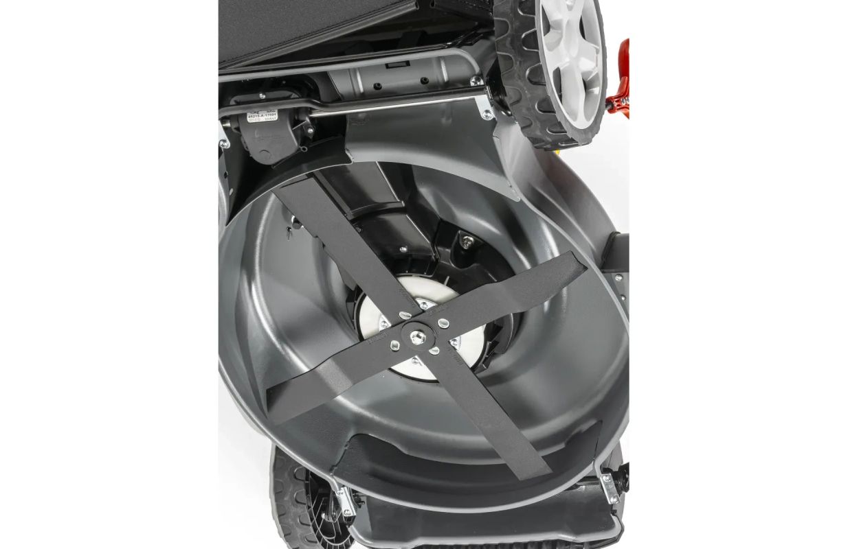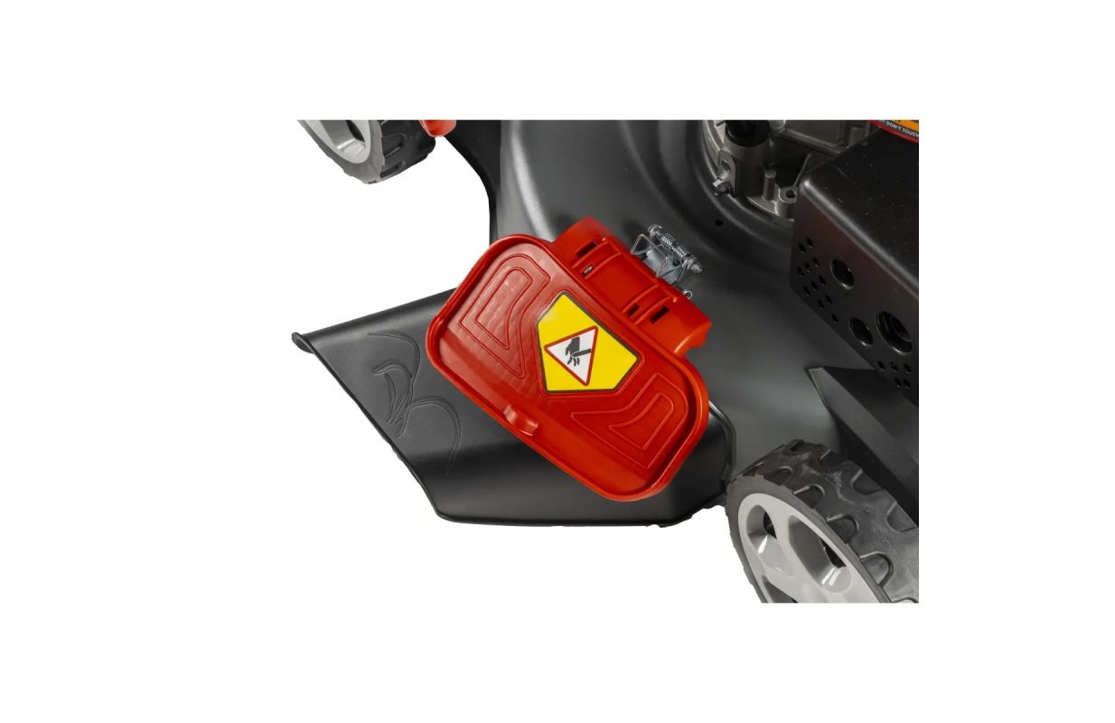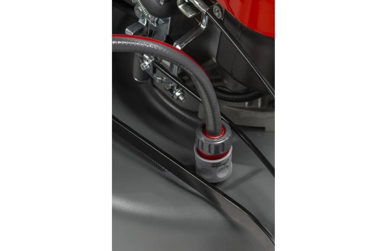 Дополнительно косилка имеет функцию промывки корпуса - мы можем подключить садовый шланг к корпусу косилки с помощью быстроразъемного соединения с внутренней резьбой - патрубок находится на корпусе косилки. При работающем двигателе мы включаем кран, вода подается через шланг на внутреннюю часть корпуса, а нож своим вращением распределяет воду и "моет" косилку снизу - там, где находится большая часть сухой травы.