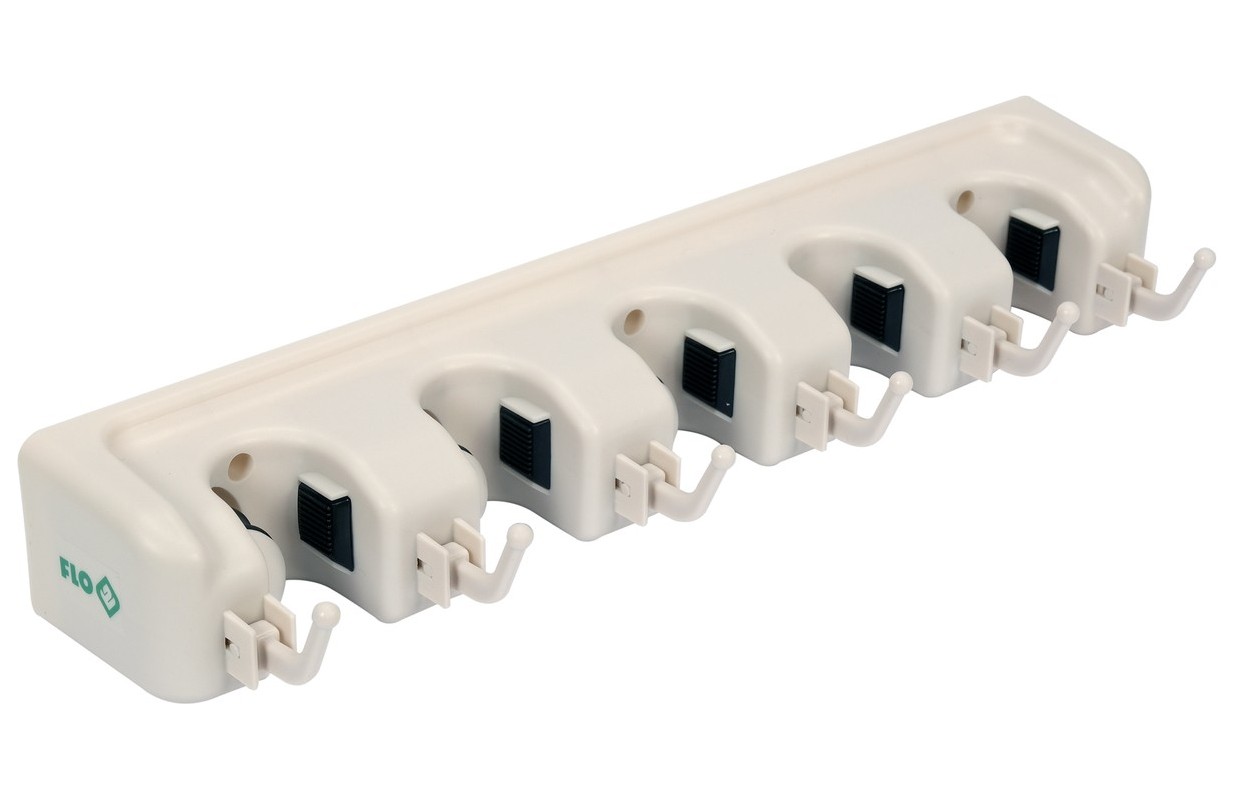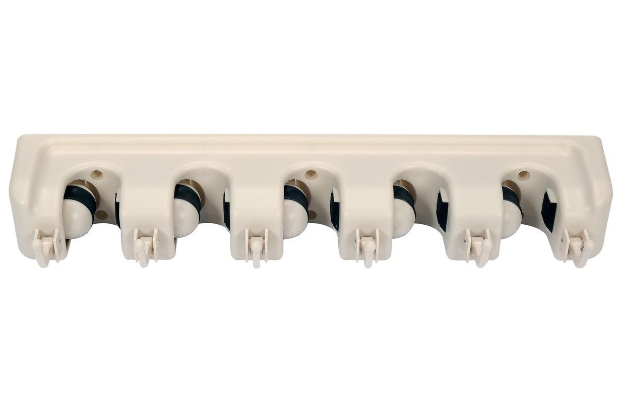 Практичная настенная вешалка для садовых и хозяйственных инструментов. Имеет 5 автоматических ручек, подстраивающихся под толщину ручки, и 6 складных крючков. Зажимы ручек работают под действием силы тяжести Материал: PP + TPR