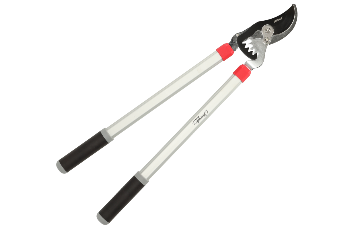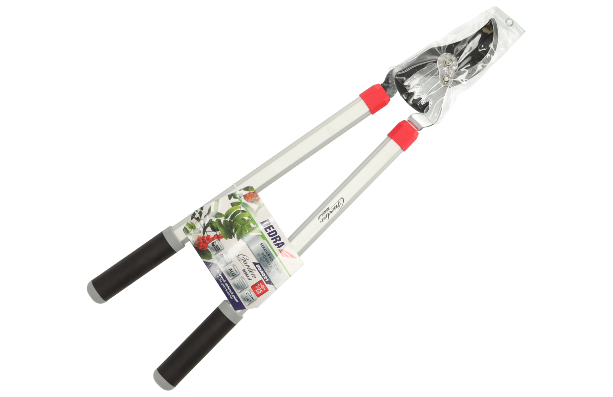 Ножницы 80A021 предназначены для обрезки живых стеблей и ветвей. Длинные рукоятки секатора позволяют достать до более высоких побегов или веток. Лезвие из марганцевой стали (Mn65) имеет тефлоновое покрытие для предотвращения прилипания и защиты лезвия от коррозии. Благодаря прочной зубчатой передаче, увеличивающей мощность, секатор без усилий срезает ветки диаметром до 35 мм. Алюминиевая рукоятка оснащена удобным хватом из двух материалов.