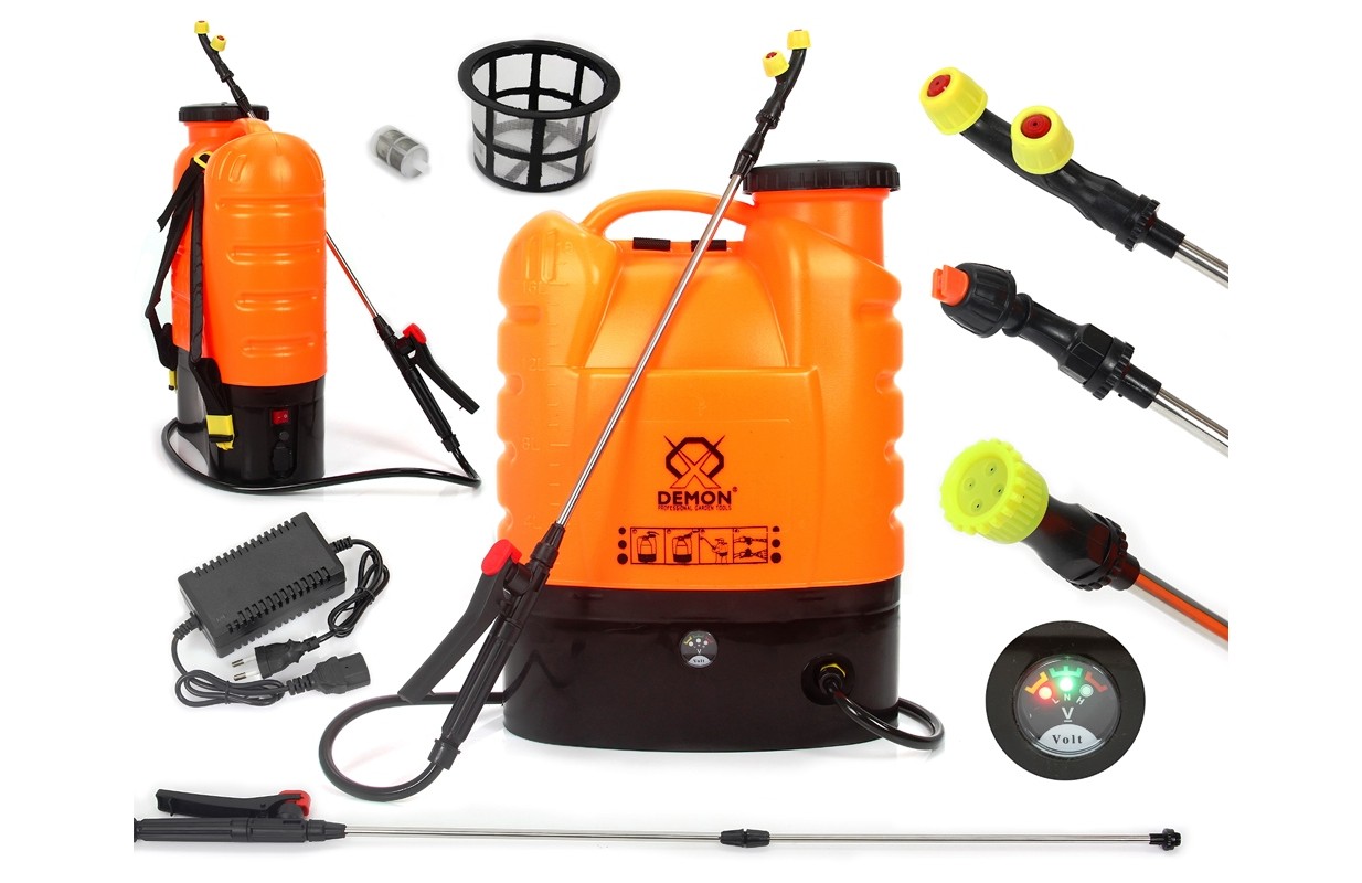 Электрический опрыскиватель известной компании DEMON – это простое в использовании устройство, которое является отличной альтернативой ручным или бензиновым опрыскивателям. Аккумулятор, которым он оснащен, позволит работать в течение долгих часов. Опрыскиватель является высокоэффективным средством защиты растений. Может применяться для профилактики болезней растений и уничтожения вредителей на больших плантациях и посевных полях зерновых, огородных, цветочных, фруктовых и чайных деревьев и т.д. Является отличным устройством для защитных и уходовых работ в овощеводстве, садоводстве, цветоводстве и питомнике. Его также можно использовать для опрыскивания гербицидами, дезинфекции.