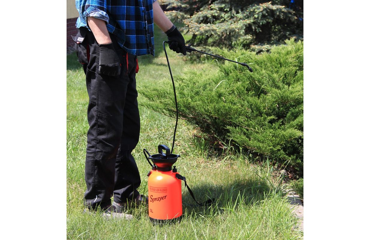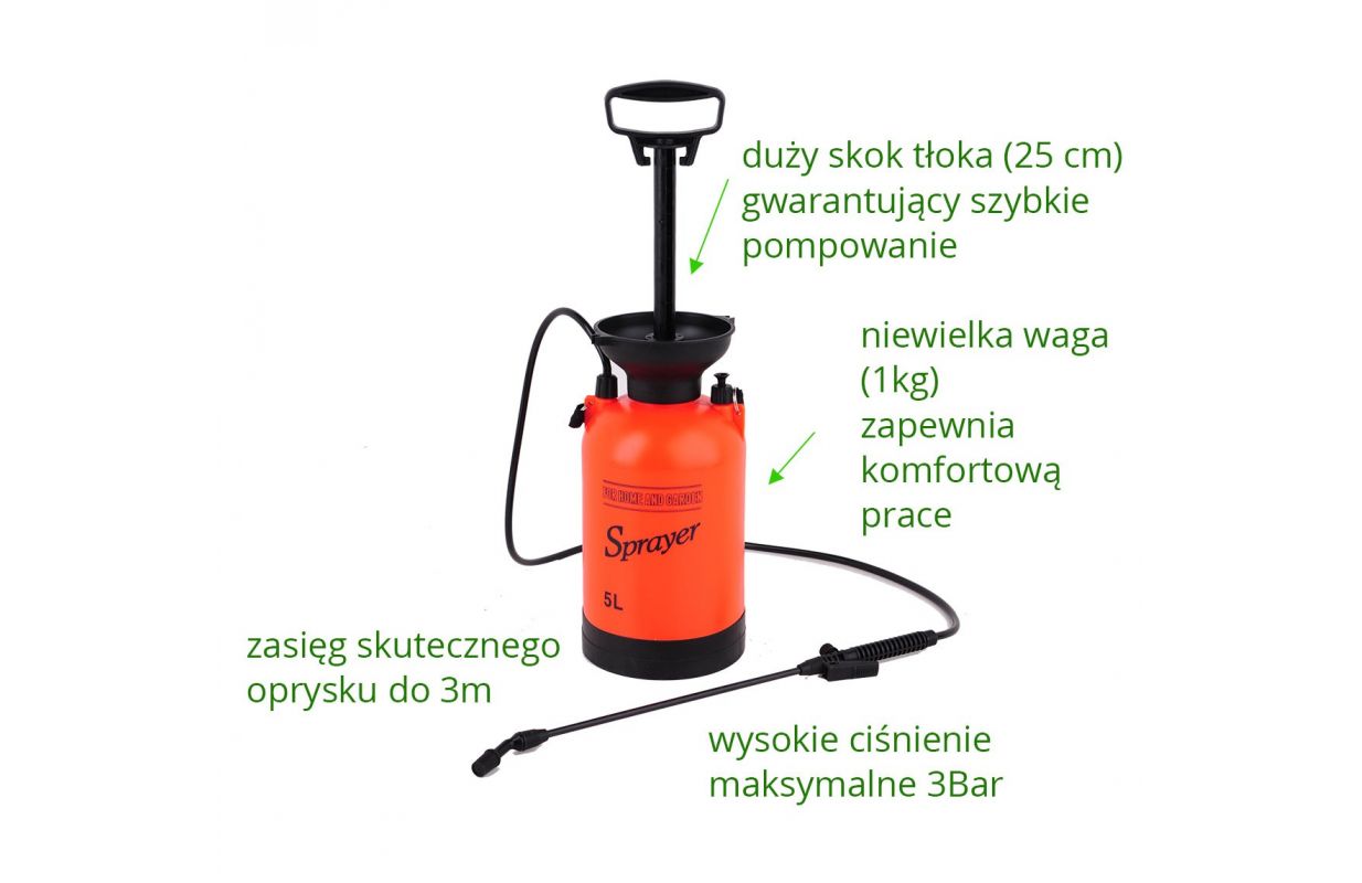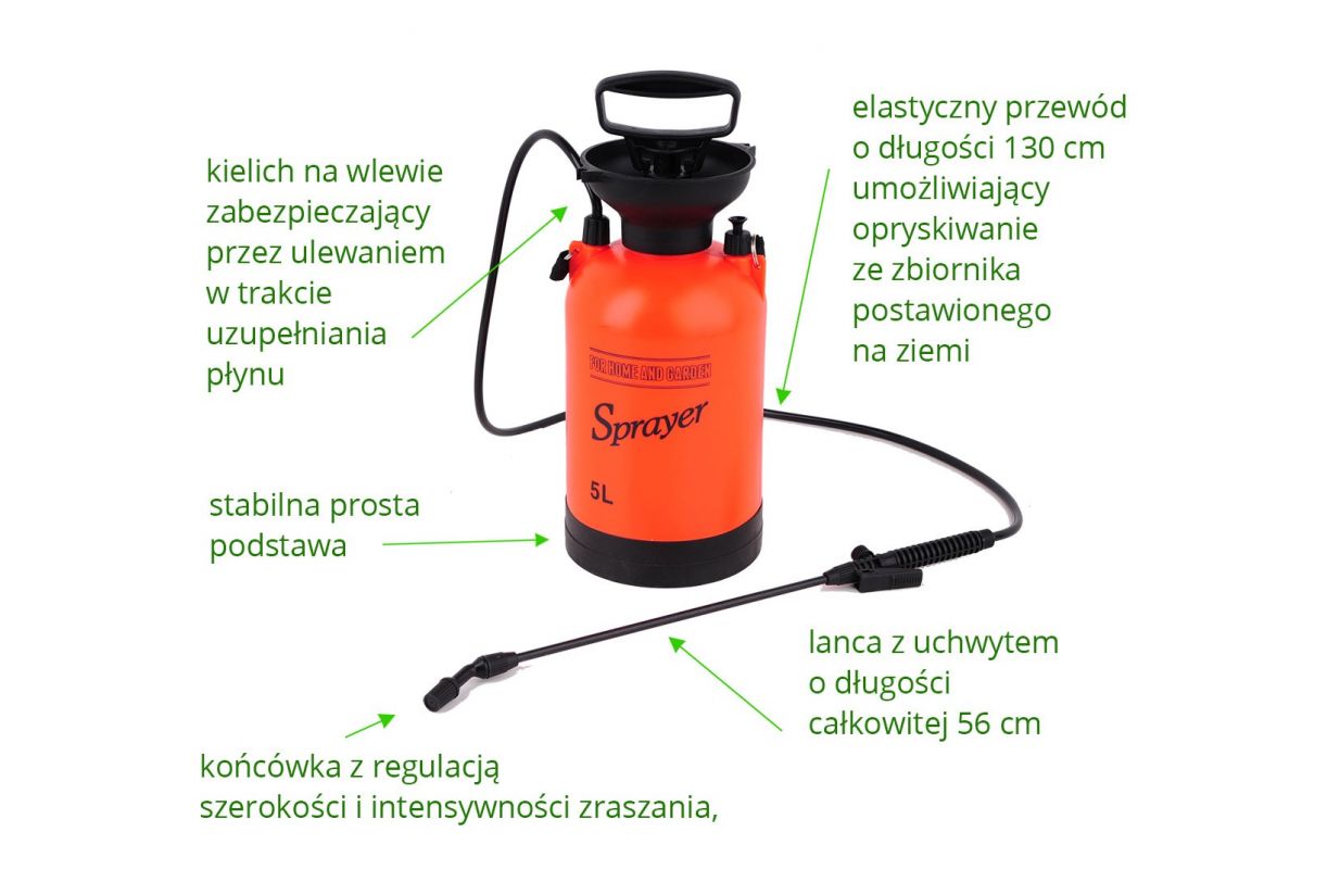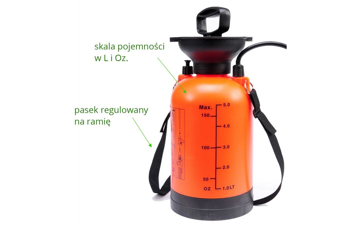 Ручной напорный опрыскиватель с емкостью бака 5л, - Охват эффективного опрыскивания до 3м, - Предохранительный клапан, защищающий от превышения максимально допустимого давления, - Большой ход 25 см обеспечивает быстрое сцеживание, - Ручка для копья общей длиной 56 см с автоматическим распылением и концом с регулируемой шириной и интенсивностью полива, - Гибкий трос длиной 130 см позволяет опрыскивать резервуар, расположенный на земле, - Стабильная простая основа - Чашка для безопасной инфузии путем срыгивания при повторном наполнении. - Два промежуточных места для хранения на копье, - Регулируемый плечевой ремень - По шкале емкости бака в литрах и унциях.
