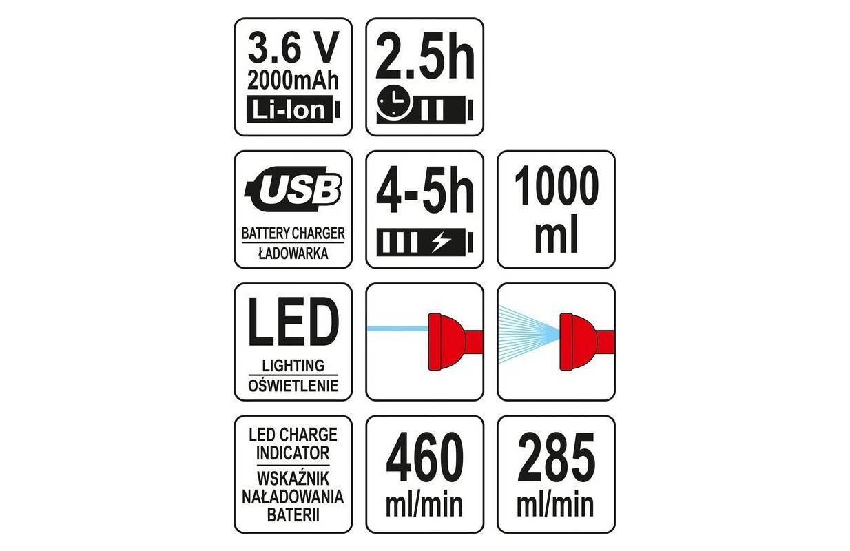 Аккумуляторный опрыскиватель позволит быстро и эффективно поливать и опрыскивать растения , но у него может быть гораздо больше применений. По сравнению с традиционными ручными разбрызгивателями нет необходимости постоянно нажимать кнопку. Разовая работа устройства на одном баке занимает до 2-3 минут, а благодаря емкому аккумулятору в 2000 мАч можно будет повторять действия даже несколько десятков раз. Дополнительным преимуществом является эргономичная прорезиненная ручка и светодиодная лампа , позволяющая использовать прибор даже в темное время суток.