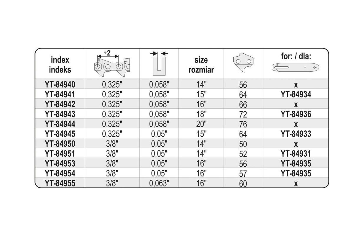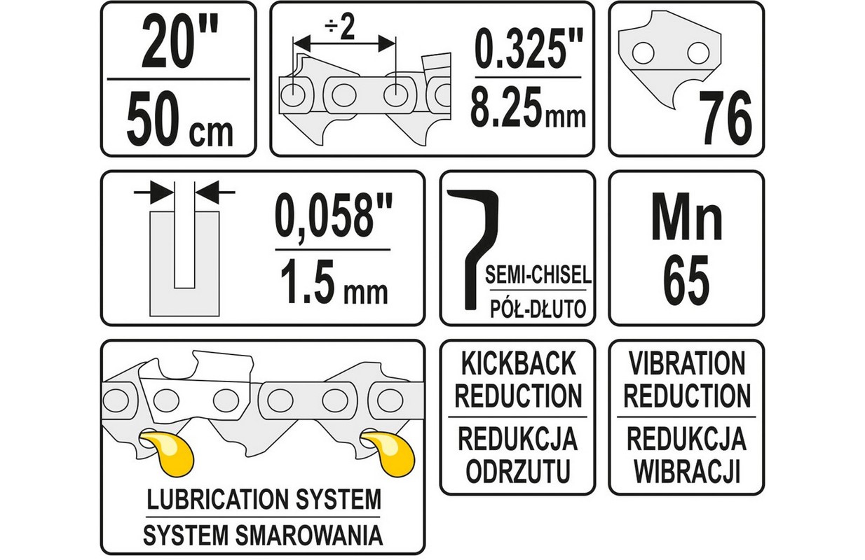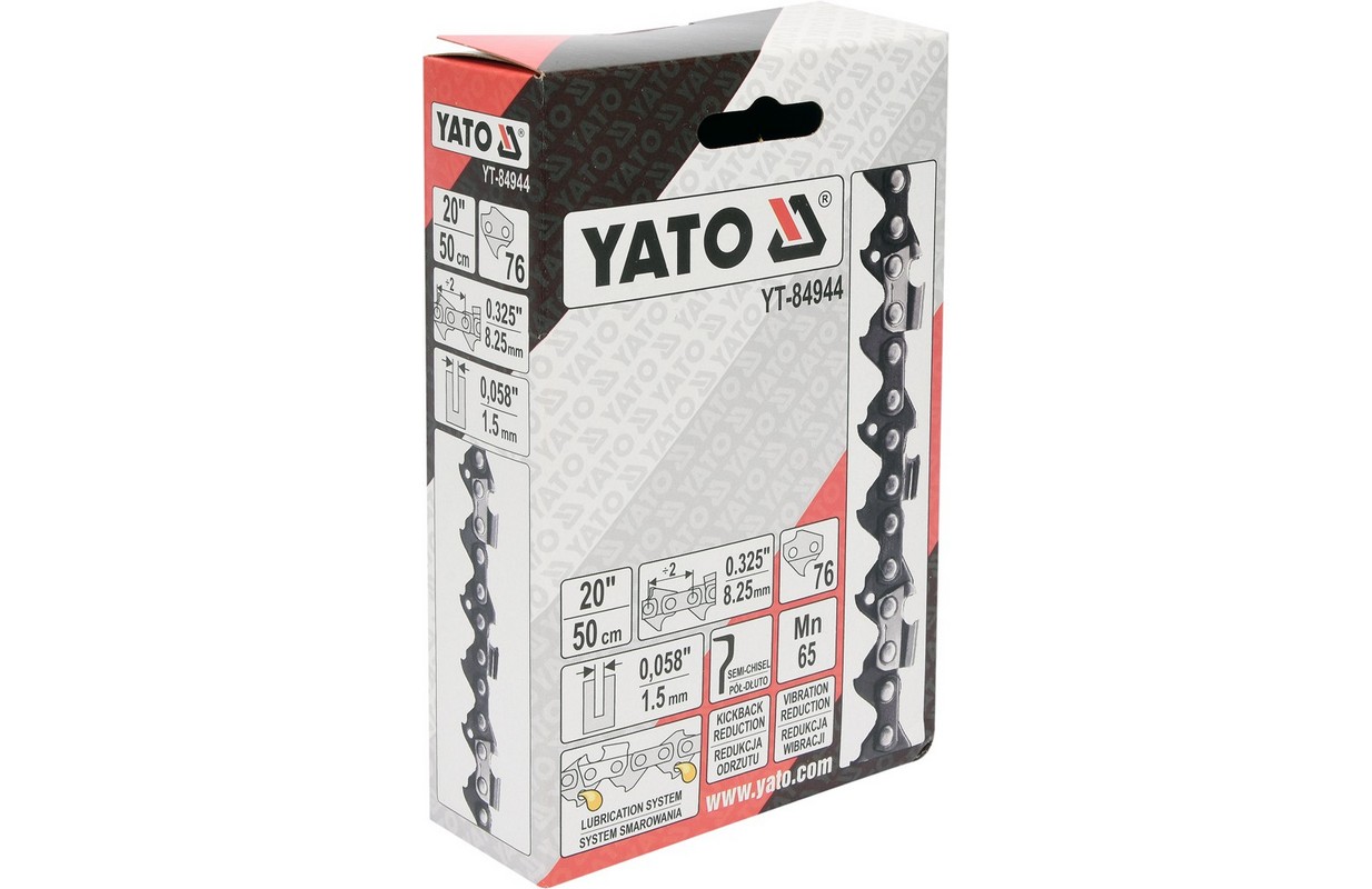Цепная пила для цепных пил и электрических цепных пил. 76 ячеек, шаг 0,325", ширина 0,058" (1,5 мм) Режущее полотно с высокой скоростью резания. Обеспечивает повышенную прочность на растяжение, благодаря чему значительно продлевается срок службы цепи. Цепи YATO имеют ряд уникальных систем, повышающих безопасность и комфорт: - Система смазки, равномерно распределяющая масло по всей длине направляющей. Это снижает сопротивление трения за счет уменьшения нагрева направляющей и увеличения срока службы всей режущей системы. - Снижение вибрации - Специальная конструкция режущих зубьев не передает вибрацию от цепи к направляющей, что снижает вибрацию на 25%. Это значительно повышает комфорт вашей работы, особенно при длительном использовании. - Уменьшение отдачи - так называемый KICKBACK - специально разработанные направляющие звенья снижают риск рецидива при резке, что значительно повышает безопасность работы. Цепочка помечена ячейками «21», которые определяют ее параметры, такие как масштаб 0,325 дюйма и ширина 0,058 дюйма. Особенно рекомендуется для использования с пилой YT-84900.