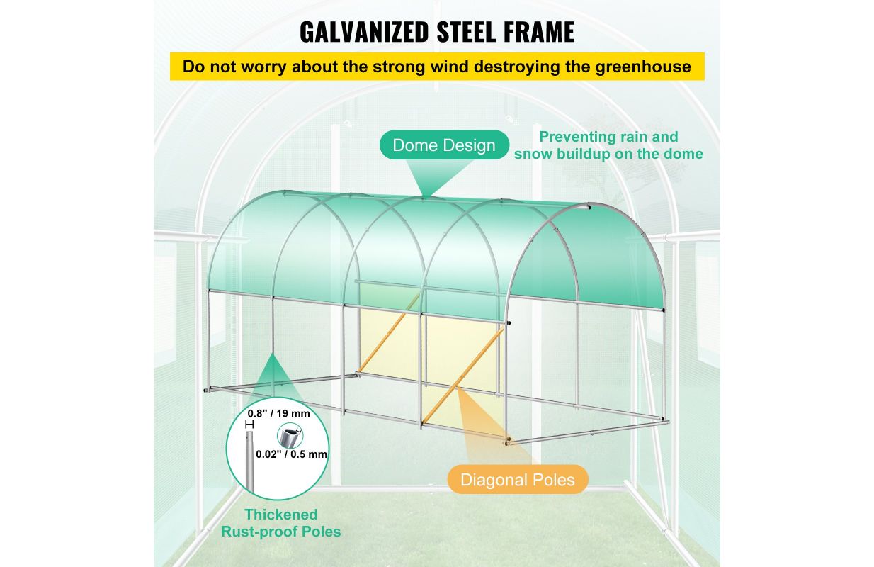 • Модернизированная оцинкованная рама: мы модернизировали оцинкованную сталь до диаметра 0,8 дюйма и толщины 0,02 дюйма. Эта высокая туннельная теплица имеет 3 верхние балки для предотвращения скопления дождя и снега на куполе. Кроме того, диагональные опоры могут обеспечить устойчивость во время экстремальных погодных условий. Мы позаботимся о вас, так что приготовьтесь к тому, что ваш урожай растет круглый год.