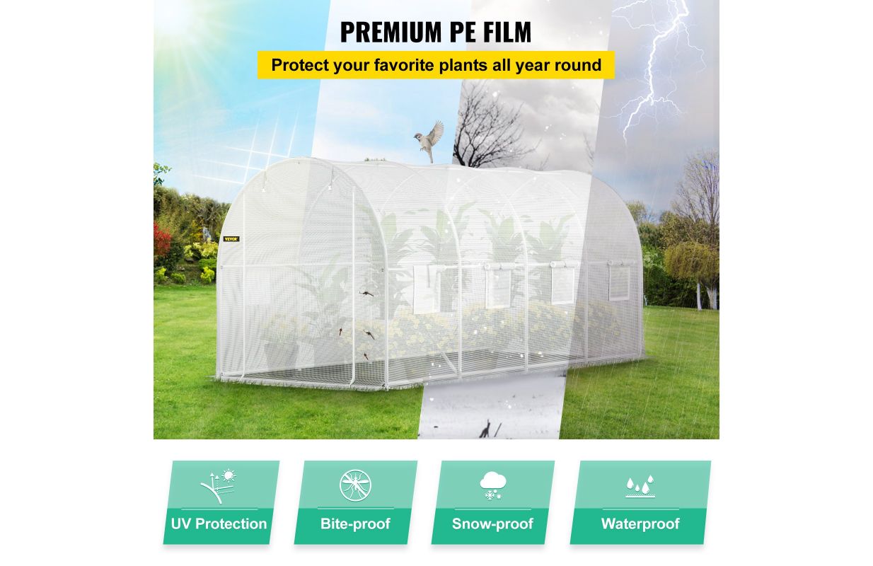 • Высококачественный водонепроницаемый полиэтилен: Туннельная теплица поставляется с полиэтиленовым покрытием, которое может защитить ваши растения от ультрафиолетовых лучей, ржавчины, снега и дождя круглый год. Размер чехла плотно прилегает к раме, повышая тепло- и ветроустойчивость зимой.