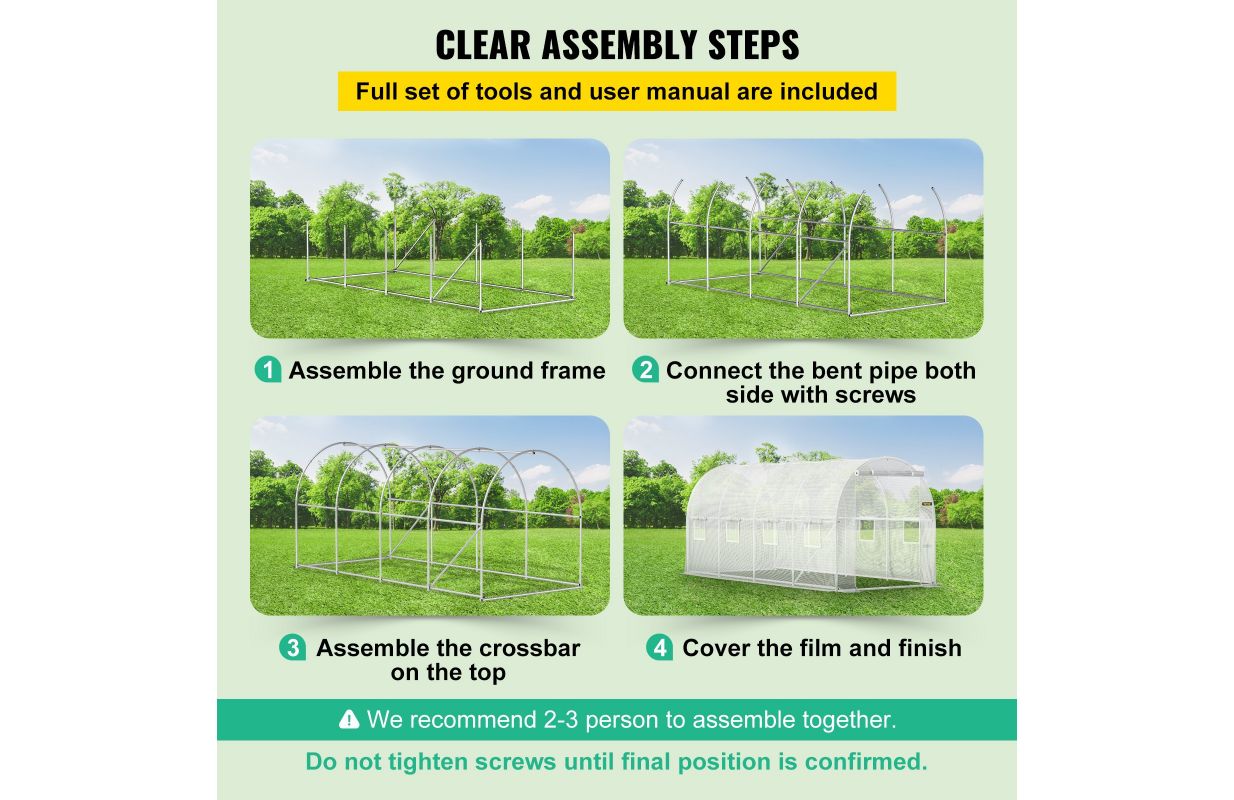 • Все инструменты в комплекте: Теплица из обруча легко собирается с помощью соединителей, а винтовые крышки могут предотвратить царапины и ржавчину. В комплект входят 4 веревки, колья и оттяжки для дополнительной безопасности, устойчивости и прочности. Примечание: Не затягивайте винты до тех пор, пока окончательное положение не будет подтверждено.