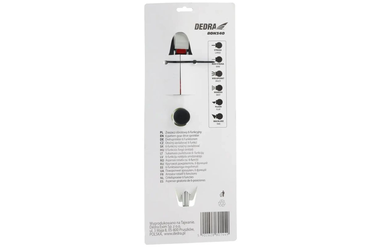 Насадка позволяет контролировать угол распыления для максимального охвата полива и выбирать 1 из 6 форм водяной рубашки. Садовый дождеватель DEDRA 80N340 имеет определенные формы струи воды: струя, мини-струя, мульти-струя, плоская рубашка, веер и мелкий туман. Встроенное соединение позволяет использовать дождеватель для расширенных систем полива путем последовательного подключения отдельных элементов, увеличивая максимальную площадь полива до 490 м2.