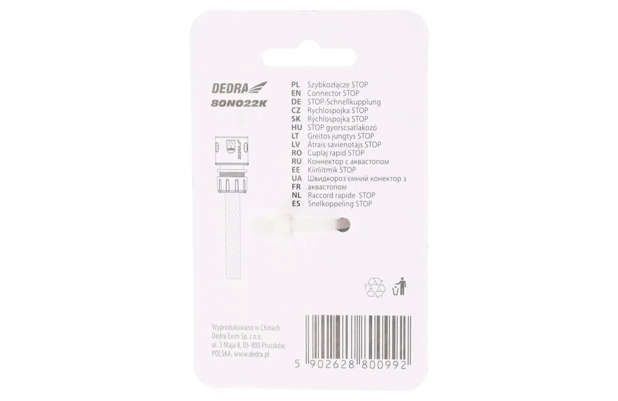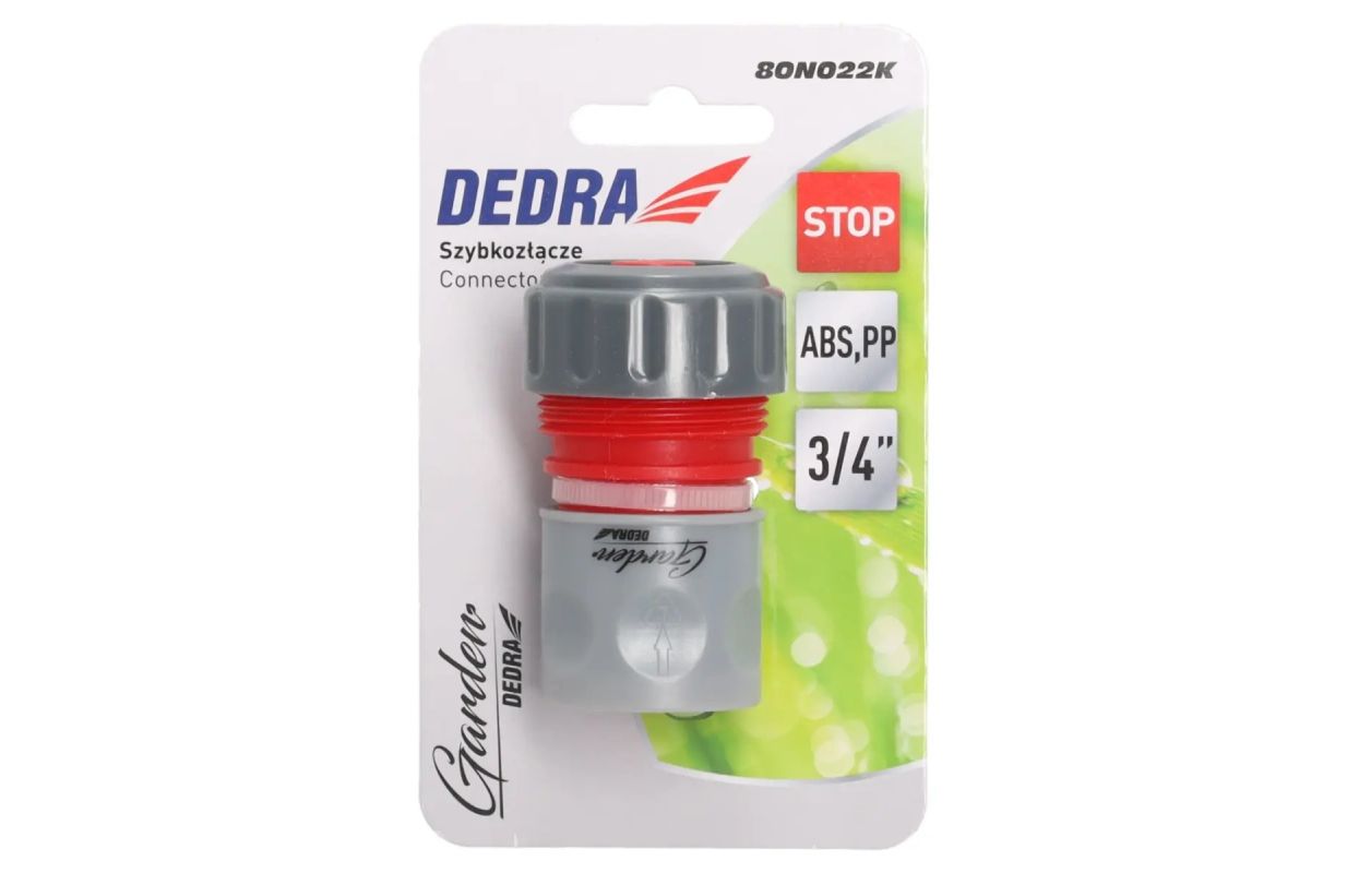 С помощью садового быстроразъемного соединения DEDRA 80N022 stop мы можем быстро и плотно соединить садовый шланг 3/4" с компонентами системы полива без использования инструментов и хомутов. Затягивая ручку, мы добиваемся надежного и плотного соединения без использования хомутов или зажимов. Быстроразъемное соединение изготовлено из прочного пластика ABS и PP, что обеспечивает долговечность конструкции. Используемый внутренний клапан перекрывает воду при отсоединении подключенного элемента, например, пистолета или разбрызгивателя. Товар продается с маркетинговой картой.