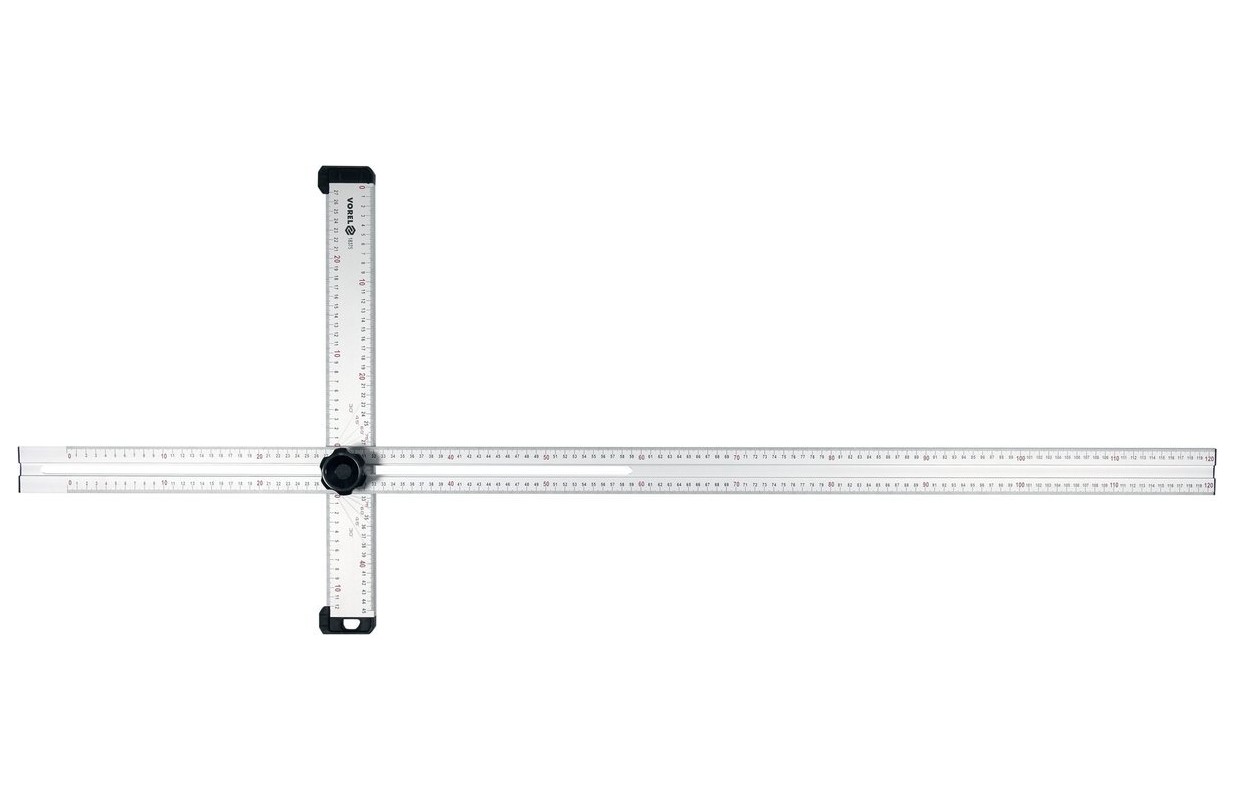 Плечи имеют длину 1200 х 320 мм с миллиметровой шкалой на всех гранях, подвижные плечи соединены фиксирующей ручкой. Концы плеч закреплены пластиковыми заглушками. Маркировка углов нанесена на поверхность уголка. Изготовлен из прочного и легкого алюминия.