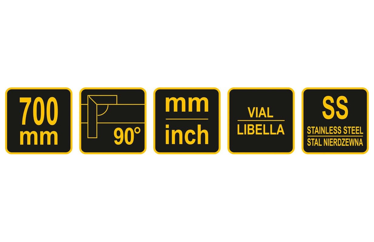 Металлический уголок 700 мм, ножка из алюминиевого профиля с установленным плафоном. Ширина более длинного плеча 40 мм, толщина 1,0 мм, длина стопы 190 мм. Миллиметровая и дюймовая шкалы с постоянной маркировкой на обеих сторонах рычага