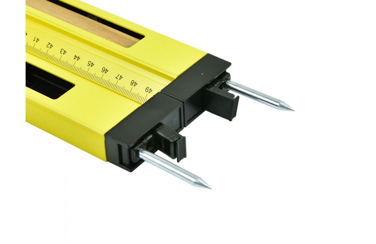 • На одной руке есть специальное место для плотницкого карандаша, а на другой руке — для двух наконечников циркуля