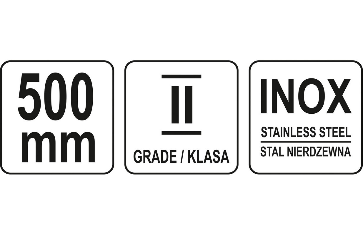 Гибкая линейка класса точности II. Изготовлен из нержавеющей стали. Миллиметровая шкала постоянно нанесена на обе кромки. Ширина 30 мм, общая длина 538 мм, толщина 1,1 мм, значения конверсии резьбы указаны на обороте.