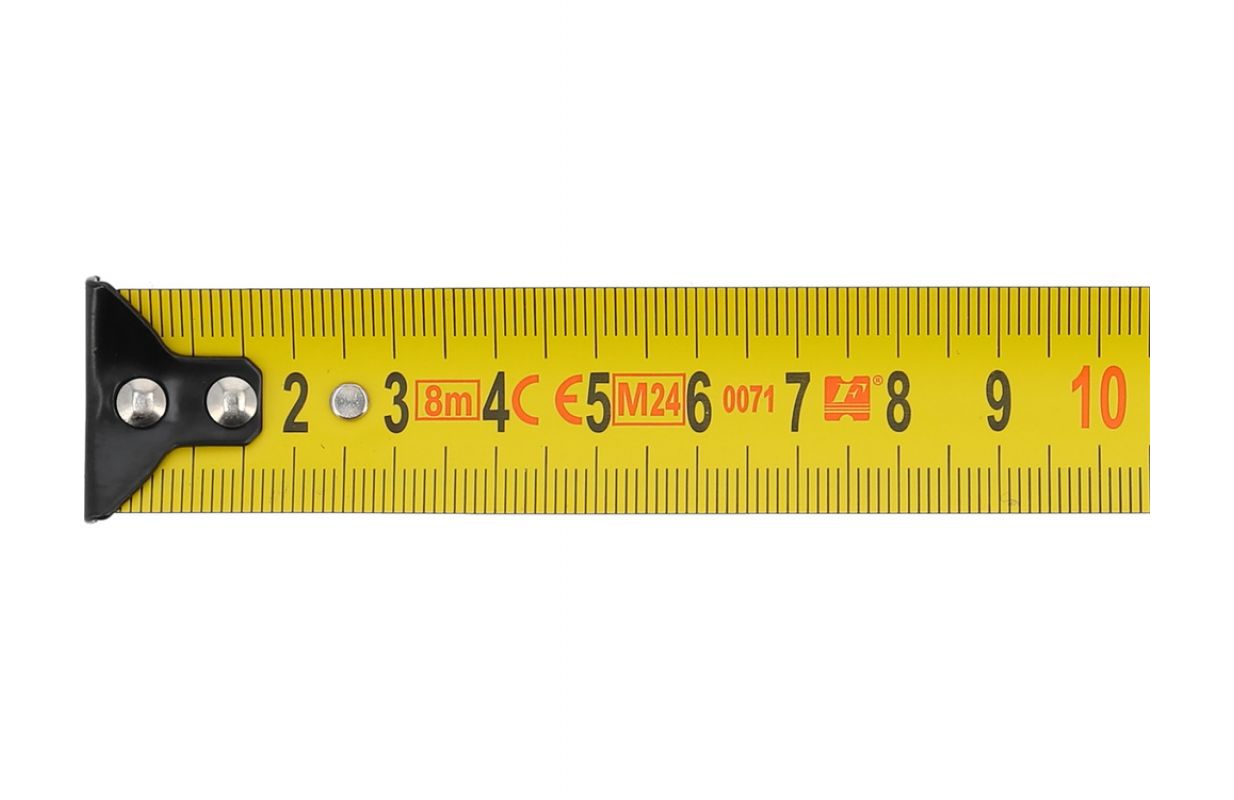 Ширина: 25 мм Длина: 8 м Жесткая стальная лента обеспечивает удлинение без опоры корпус изготовлен из прочного и устойчивого АБС-пластика миллиметровая шкала кнопка блокировки ленты