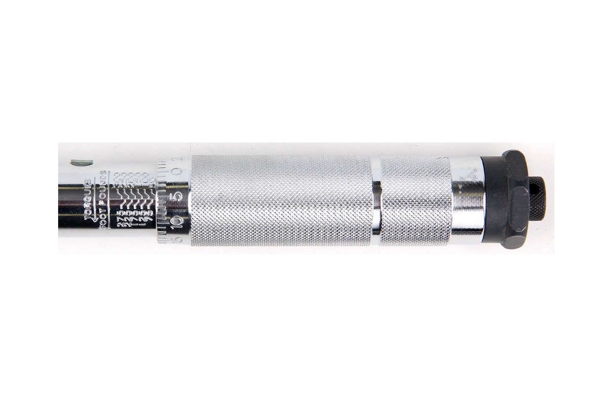 - Поверните ручку микрометра по часовой стрелке, пока не будет установлен желаемый крутящий момент. Требуемый крутящий момент устанавливается, когда градуировка на циферблате микрометра совпадает с вертикальной линией на рычаге ключа.