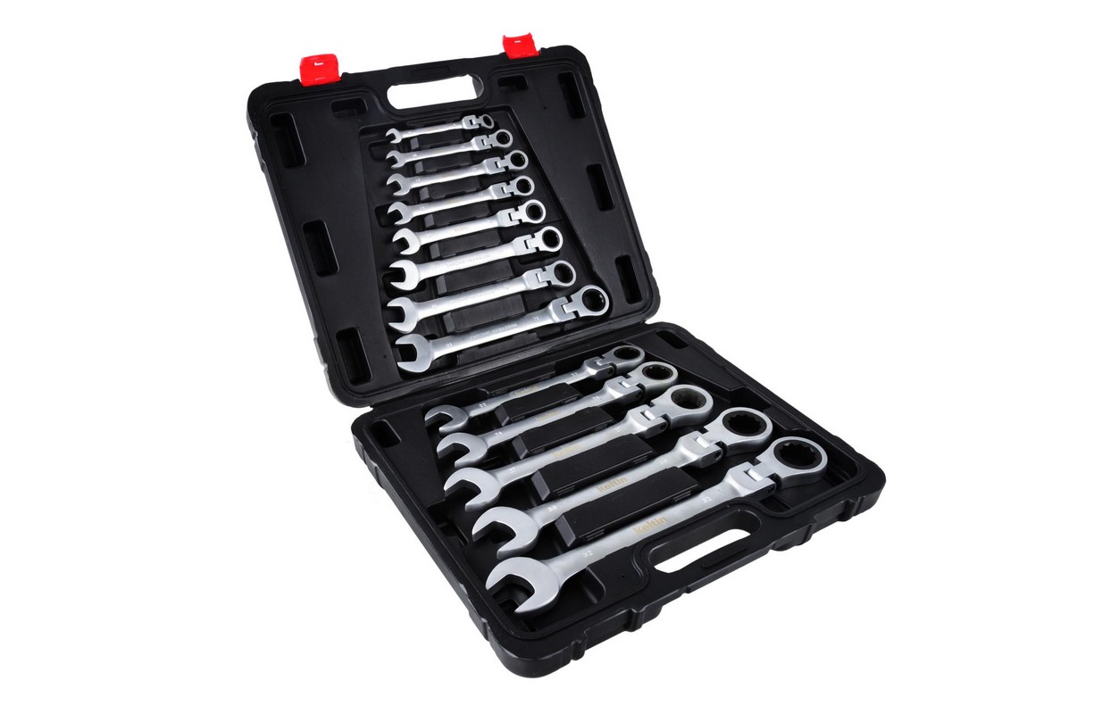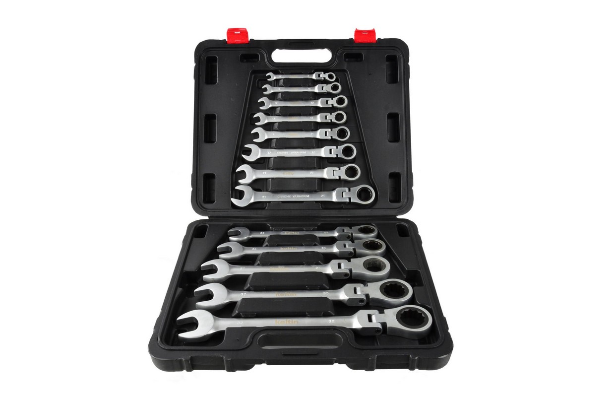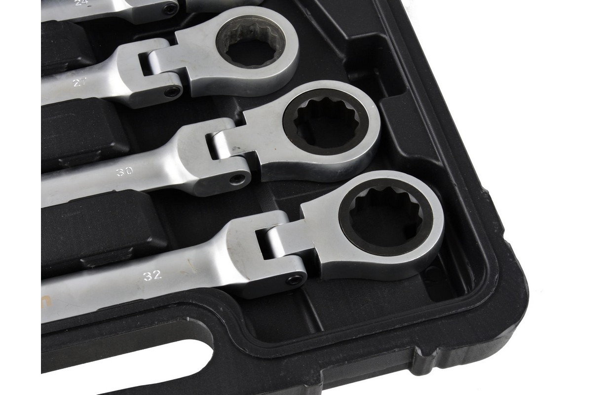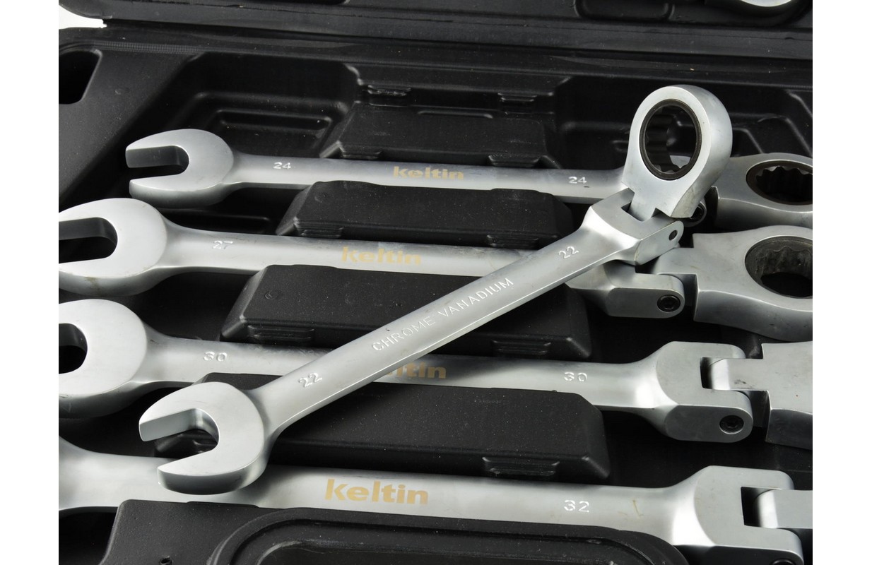 Набор комбинированных гаечных ключей с храповым механизмом (72 зуба) 8-32 мм из прочной хромованадиевой стали (CrV). Они будут использоваться в профессиональных автомастерских, а также в домашнем гараже. Ключи помещены в удобный пластиковый кейс.