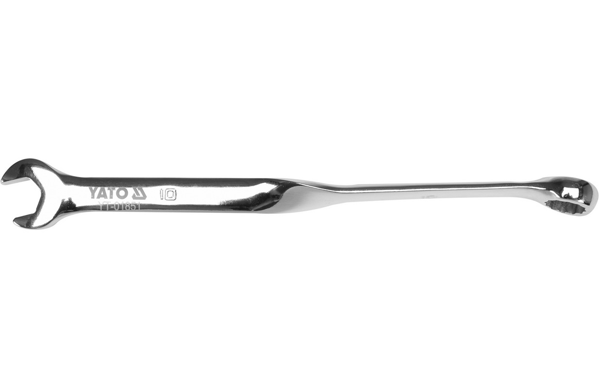 Комбинированный ключ YATO YT-01851 на 10 мм. Комбинированные ключи из высококачественной стали. Эргономичная витая форма облегчает работу и обеспечивает большой комфорт, особенно в случае сильно закрытых винтов. • ручка, закрученная на 90°, идеально ложится в ладонь, передавая большее давление на ключ при закручивании винтов, с меньшей нагрузкой на пользователя • наклон головки на 15° • изготовлен из прочной стали, полированная поверхность.