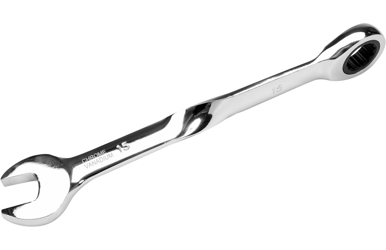 Ключ комбинированный витой с трещоткой 15 мм производства YATO YT-01877. Ключ заканчивается храповым кольцом с одной стороны и плоским наконечником с другой. Эргономичная витая форма облегчает работу и обеспечивает большой комфорт, особенно в случае сильно закрытых винтов. • закрученная на 90° рукоятка идеально ложится в руку, передавая большее давление на ключ при закручивании винтов, с меньшей нагрузкой на пользователя • трещотка позволяет быстрее закручивать и откручивать винты • головка наклонена на 15° • изготовлена из высокопрочного качественная хромованадиевая сталь, полированная поверхность • твердость: 40-45 HRC • 72 зубца.