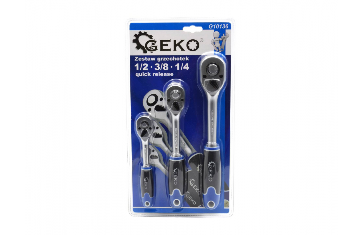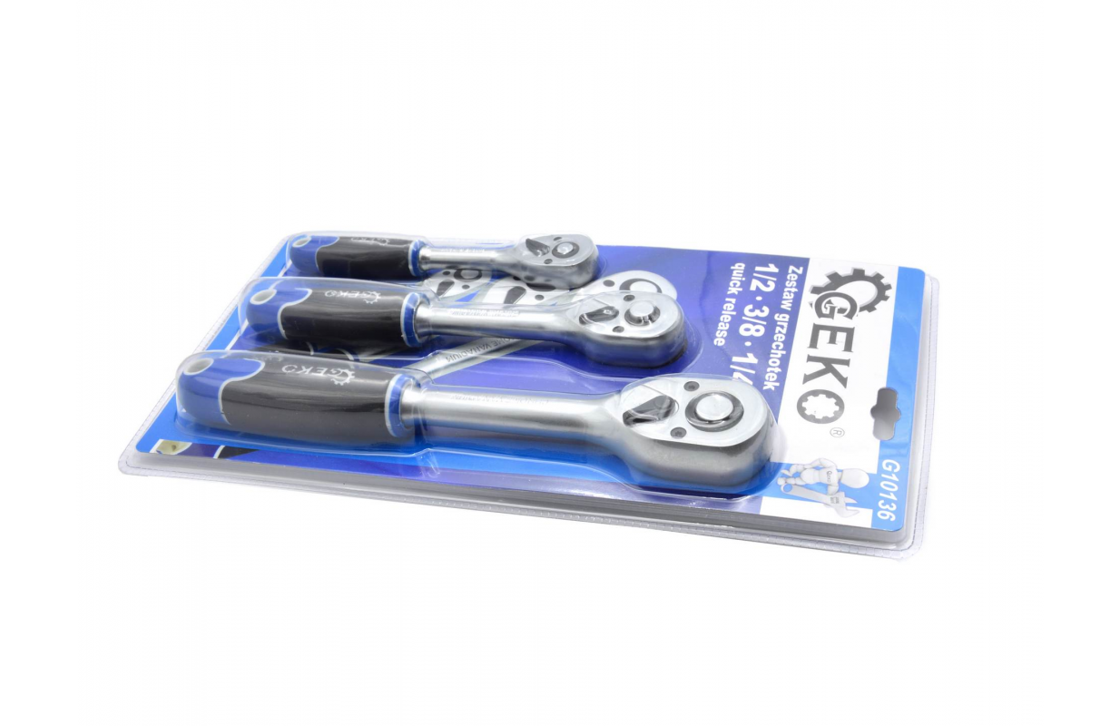 Набор прямых трещоток от известного бренда инструментов GEKO, основанный на прочном и точном механизме из 45 зубьев. Предназначен для работы с торцевыми головками 1/2", 3/8", 1/4". Трещотки изготовлены из хромованадиевой стали высочайшего качества (CrV).