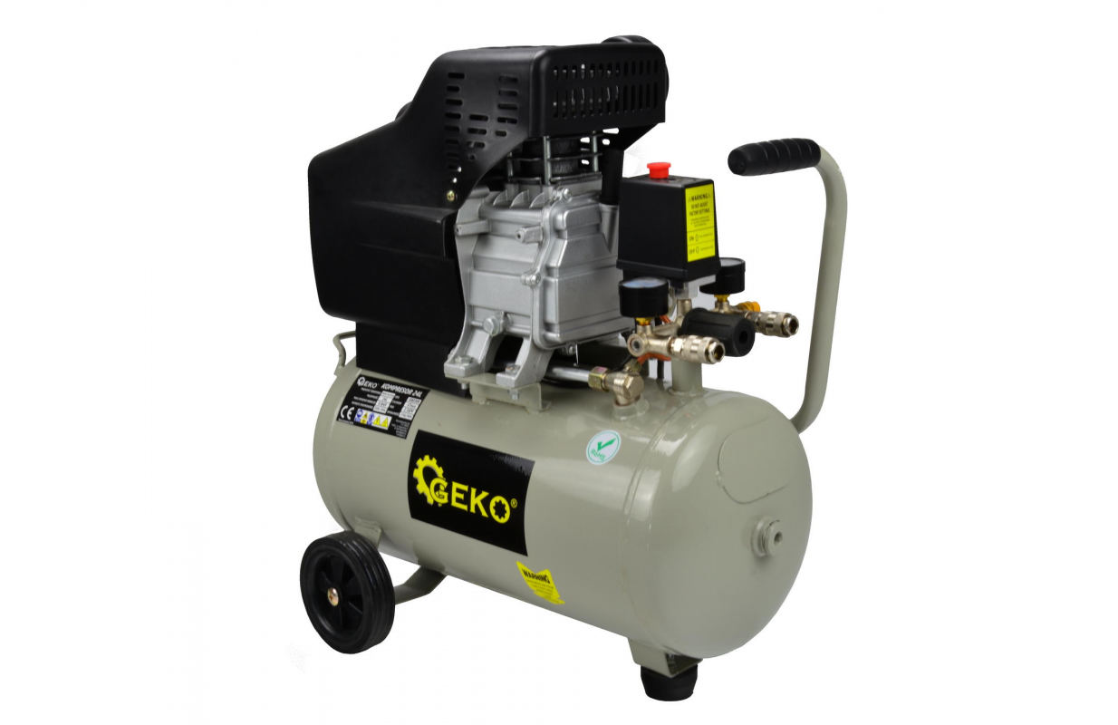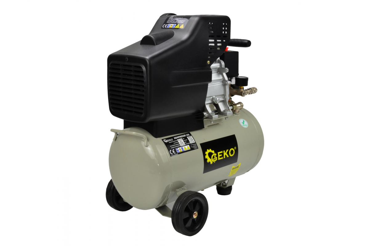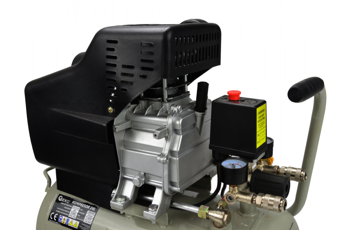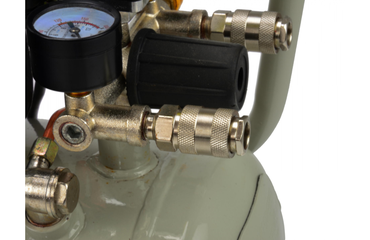 Масляный коммиссор емкостью бака 24 литра. Этот компрессор оснащен насосом с масляной смазкой, подходящим для длительной работы. В комплекте с манометром, показывающим давление в баке, и редуктором давления с манометром, с помощью которого можно установить выходное давление и произвести его показания.
