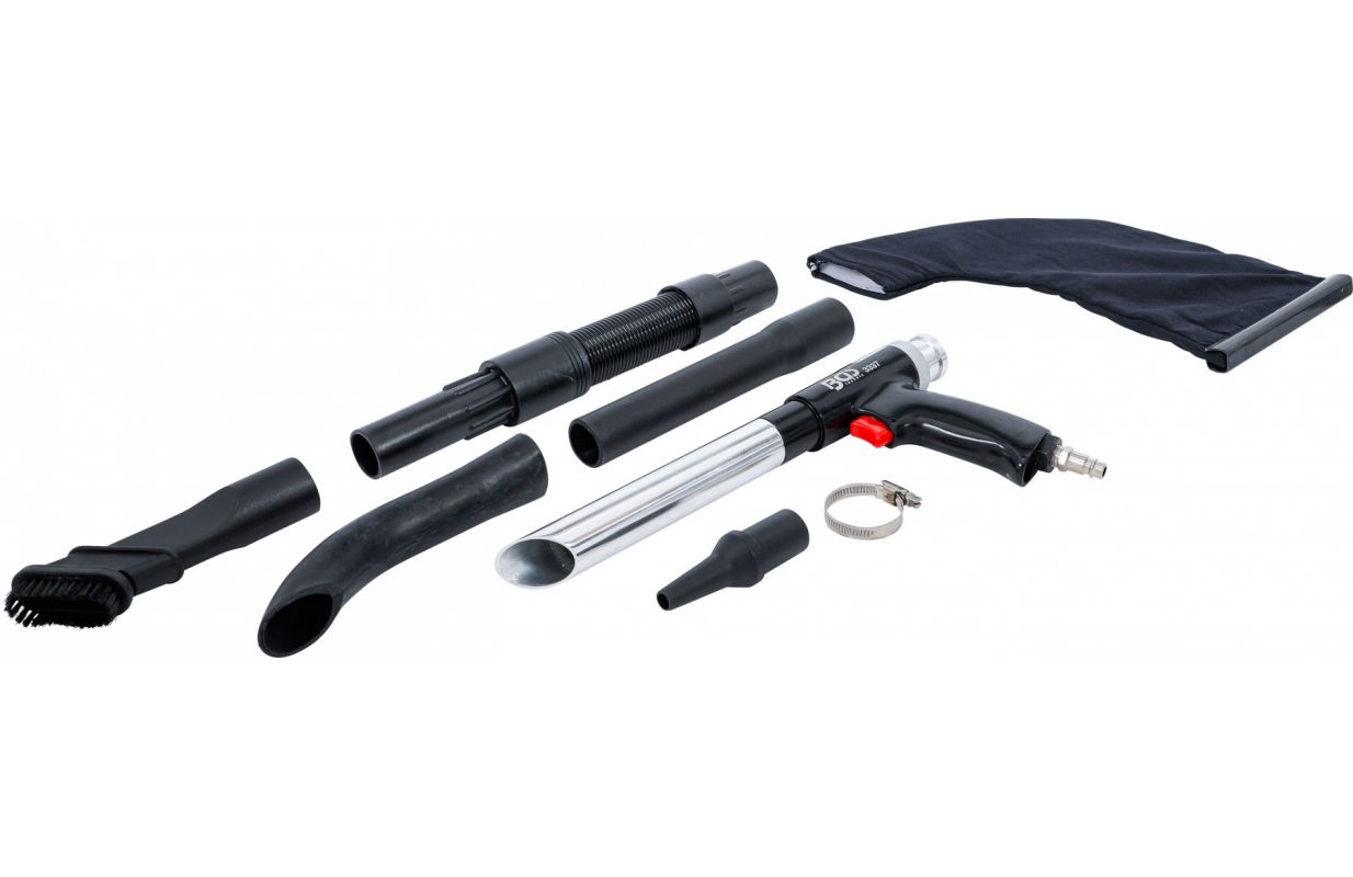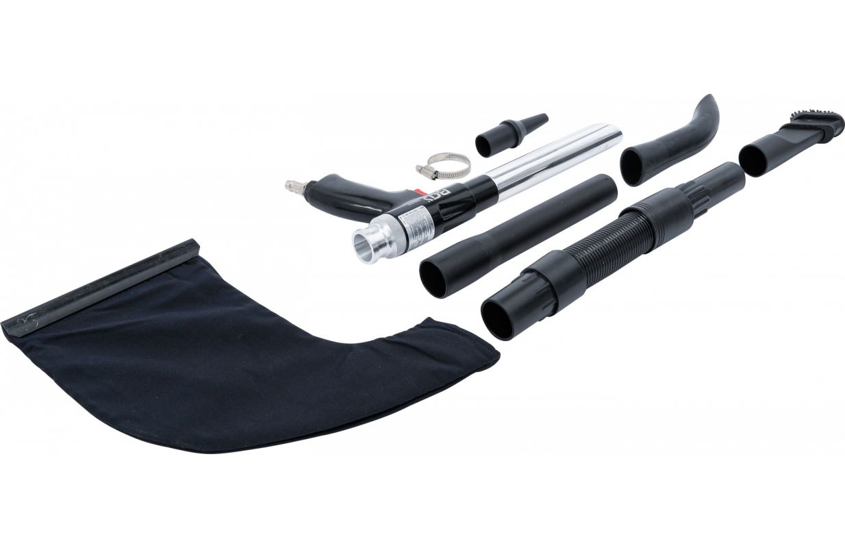 1 пистолет для обдува воздухом и отсасывания (металлический корпус) 1 гибкая, бесступенчато регулируемая телескопическая трубка, 325 мм 1 насадка для трубки, прямая 1 насадка на трубку, угловая 1 круглое сопло 1 насадка для щетки 1 сумка для сбора 1 крепежный зажим