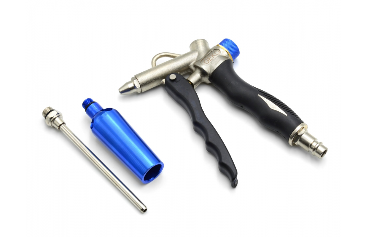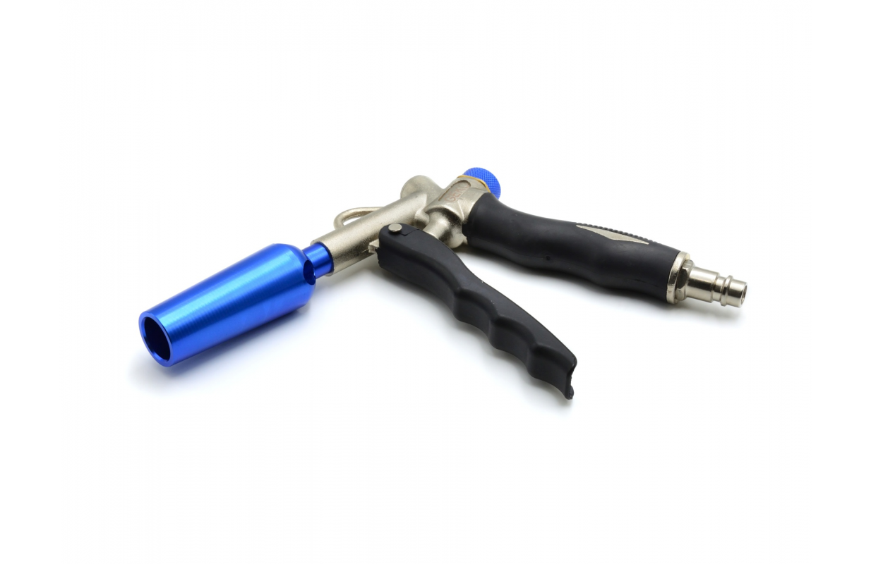 Воздушный пистолет с регулятором расхода, оснащенный соплом Вентури. Сопло Вентури увеличивает поток воздуха на 100% без перегрузки компрессора.