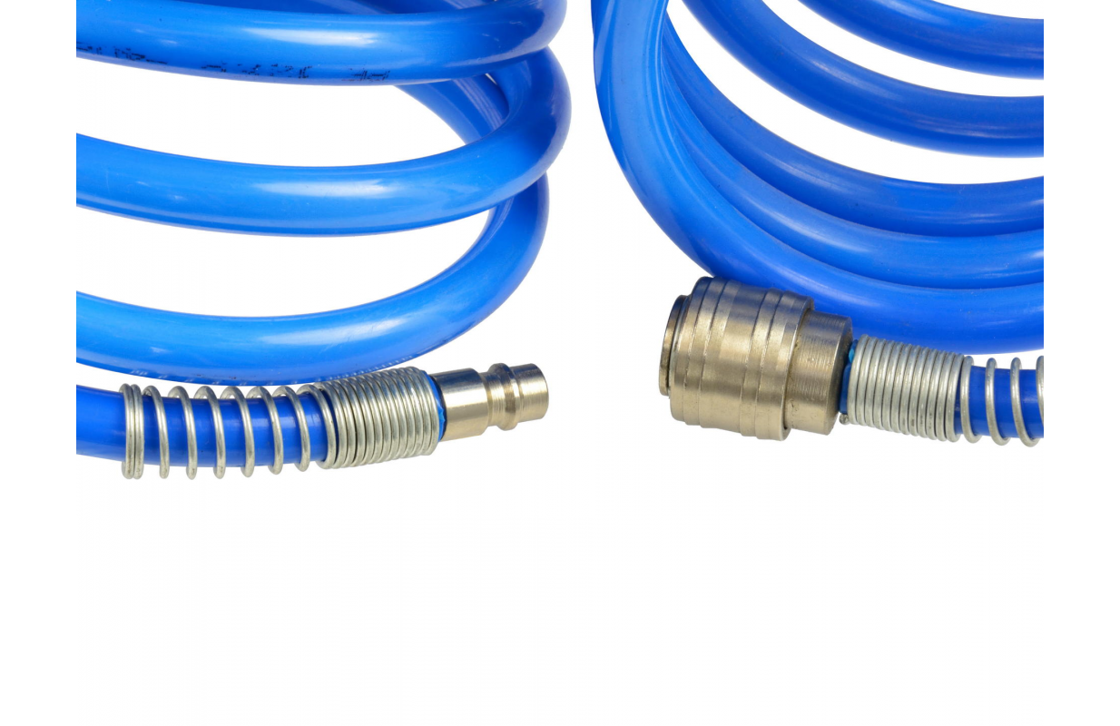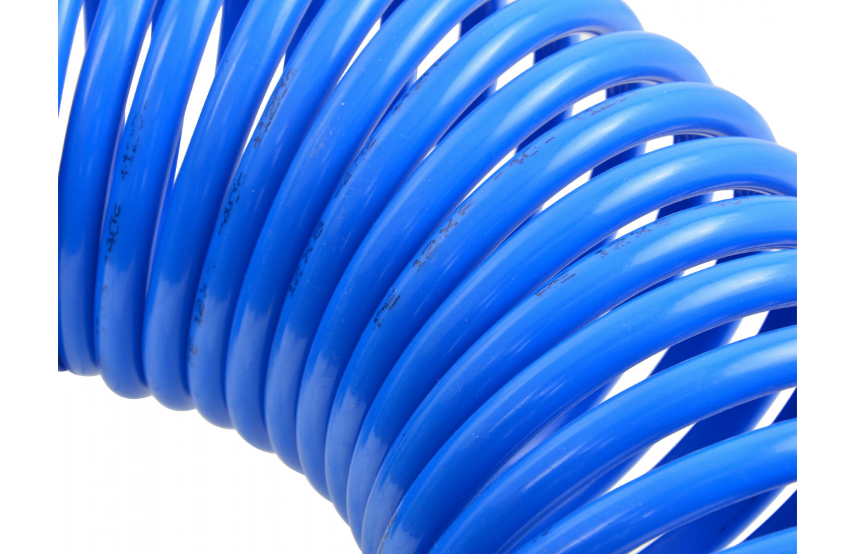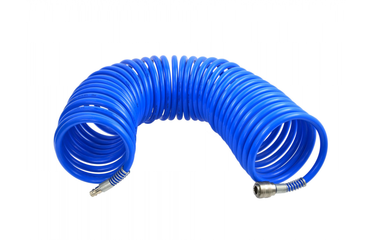 Полиэтиленовый спиральный пневматический шланг с поворотными концами и предохранительными пружинами на концах.