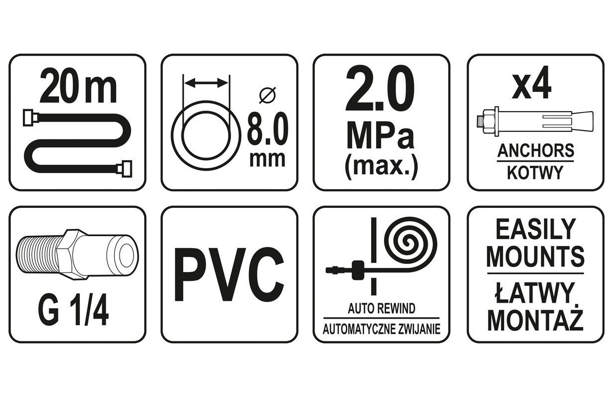 Пневмопровод длиной 20 метров на автоматическом барабане. Необходим для питания пневматических инструментов. Полезно в каждой мастерской и производственном предприятии. • длина кабеля: 20 м • диаметр: 8 мм • Рабочее давление [МПа]: 2 • Размер быстроразъемного соединения [дюйм]: 1/4 " •гибкий • устойчив к высоким и низким температурам, растяжению и действию агрессивных химикатов • доступен в корпусе с автоматическим барабаном, что обеспечивает хорошую защиту кабеля и удобство использования • Входящие в комплект анкеры позволяют легко установить на рабочий стол или стену • скованы стандартными сосками