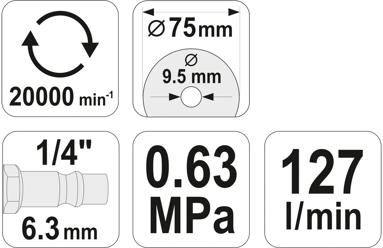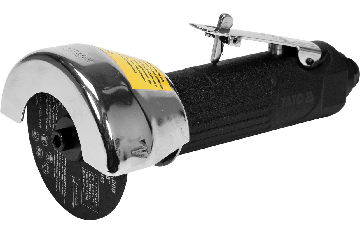 ОТРЕЗНОЙ ДИСК 3 ДЮЙМА ИЛИ 75 ММ, СВОБОДНАЯ СКОРОСТЬ 20000 ОБ/МИН, ВХОД ВОЗДУХА 1/4", ВОЗДУШНЫЙ ШЛАНГ 3/8", РАСХОД ВОЗДУХА 127 Л/МИН, РАБОЧЕЕ ДАВЛЕНИЕ 6,3 БАР; ОТДЕЛКА BLACK-HAMMER TONE