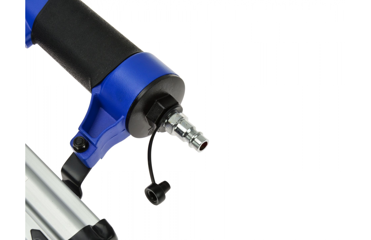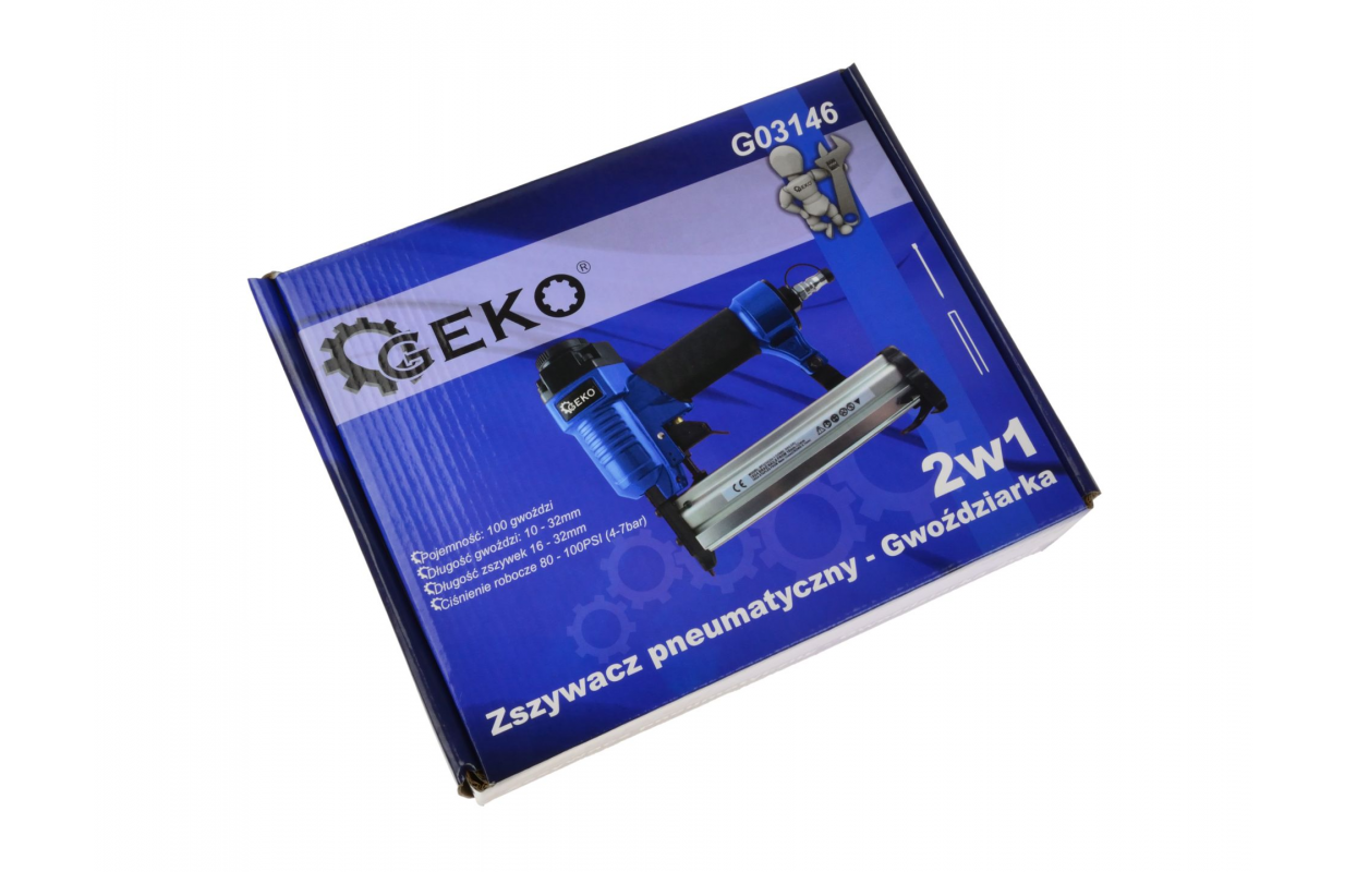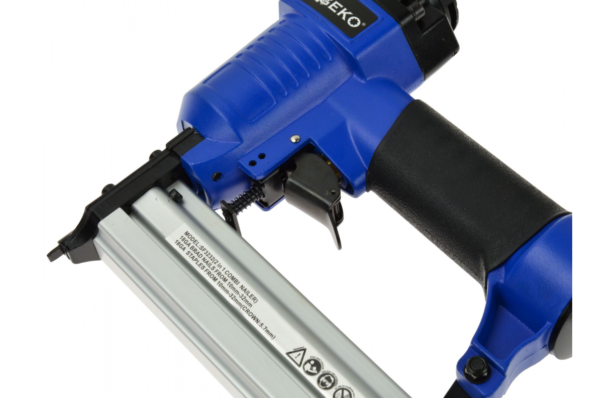 Пневматический степлер / гвоздезабиватель 2-в-1, предназначенный для различных видов обивки и столярных работ. Степлеры изготовлены из высококачественных материалов, эргономичная ручка с резиновым покрытием обеспечивает комфорт и надежное сцепление при работе. Инструмент приспособлен для стандартных скоб и обивочных гвоздей (гвозди: 10-32 мм, скобы: 16-32 мм). Характеристики продукта: