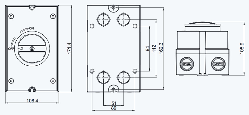 Технические характеристики: Количество полюсов: 4. Номинальное напряжение (Ue): 230–440 В переменного тока. Номинальный ток (In): 32 А. Напряжение изоляции (Ui): 1000 В. Номинальное импульсное выдерживаемое напряжение (Uimp): 2,5 кВ. Механический ресурс: 10 000 циклов. Электрический ресурс: 1500 циклов. Класс защиты: IP65. Сечение жилы кабеля: 4,0–16,0 мм². Цвет: белый. Размеры: 171,4 x 108,4 x 108,9 мм. Номинальный ток выключателя: AC-21A. Соответствует: IEC 60947-3, сертифицировано EESS.