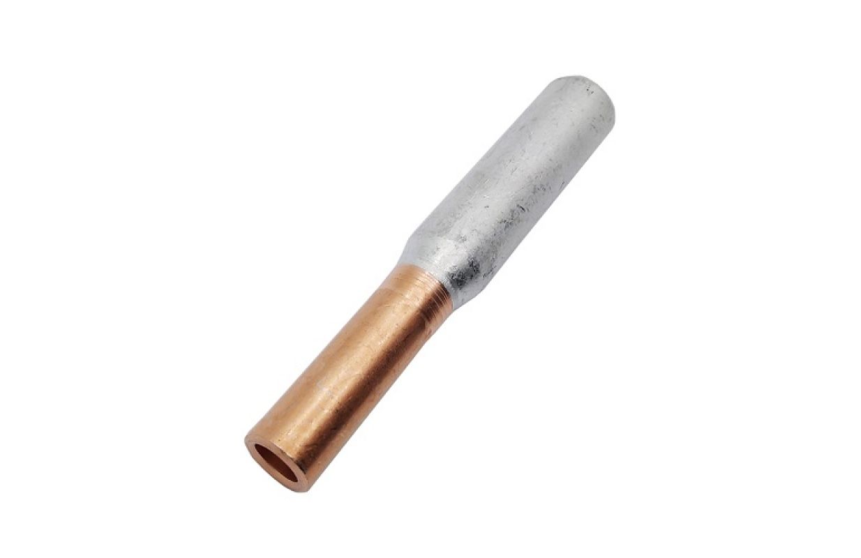 Биметаллический соединитель (перемычка) Al+Cu, для кабелей 50+35 мм2, 10 шт. Характеристики: Предназначен для соединения алюминиевых секторных проводников с обычными многопроволочными медными проводниками. Заполнен герметизирующим компаундом. Сплошной центральный барьер. Сварен трением. Характеристики: Сечение алюминиевого кабеля: 50,0 мм2. Сечение медного кабеля: 35,0 мм2. Материал: алюминий >/=99,5% + медь >/=99,9%. Поверхность: блестящая. Изоляция: нет. Длина: 90 мм. Глубина алюминиевого соединителя: 42 мм. Глубина медного соединителя: 32 мм. Смотровое отверстие: нет. Внутренний диаметр алюминиевого соединителя: 9,5 мм. Внешний диаметр алюминиевого соединителя: 16 мм. Внутренний диаметр медного соединителя: 8,5 мм. Внешний диаметр медного соединителя: 13 мм. В комплекте 10 шт.