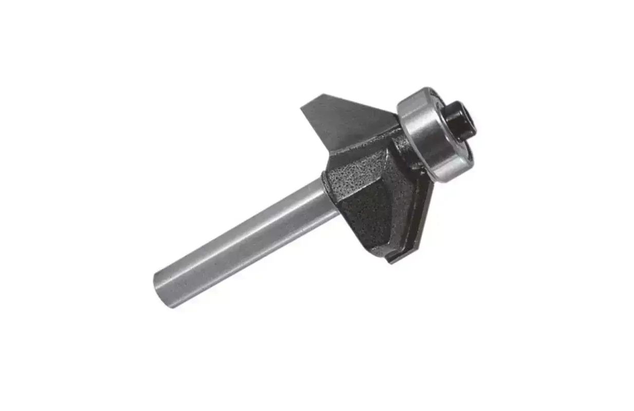 Фреза для снятия фаски по дереву с подшипником изготовлена из быстрорежущей стали HSS. Лезвие с двойной пластиной изготовлено из спеченного карбида. Фреза подходит для обработки массивной древесины, а также фанеры, ДСП, МДФ. Фреза оснащена направляющим подшипником. Головка фрезы покрыта молотковым покрытием, которое является термостойким. Диаметр держателя фрезы 6 мм.