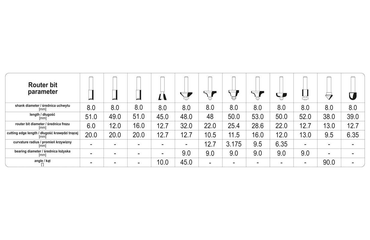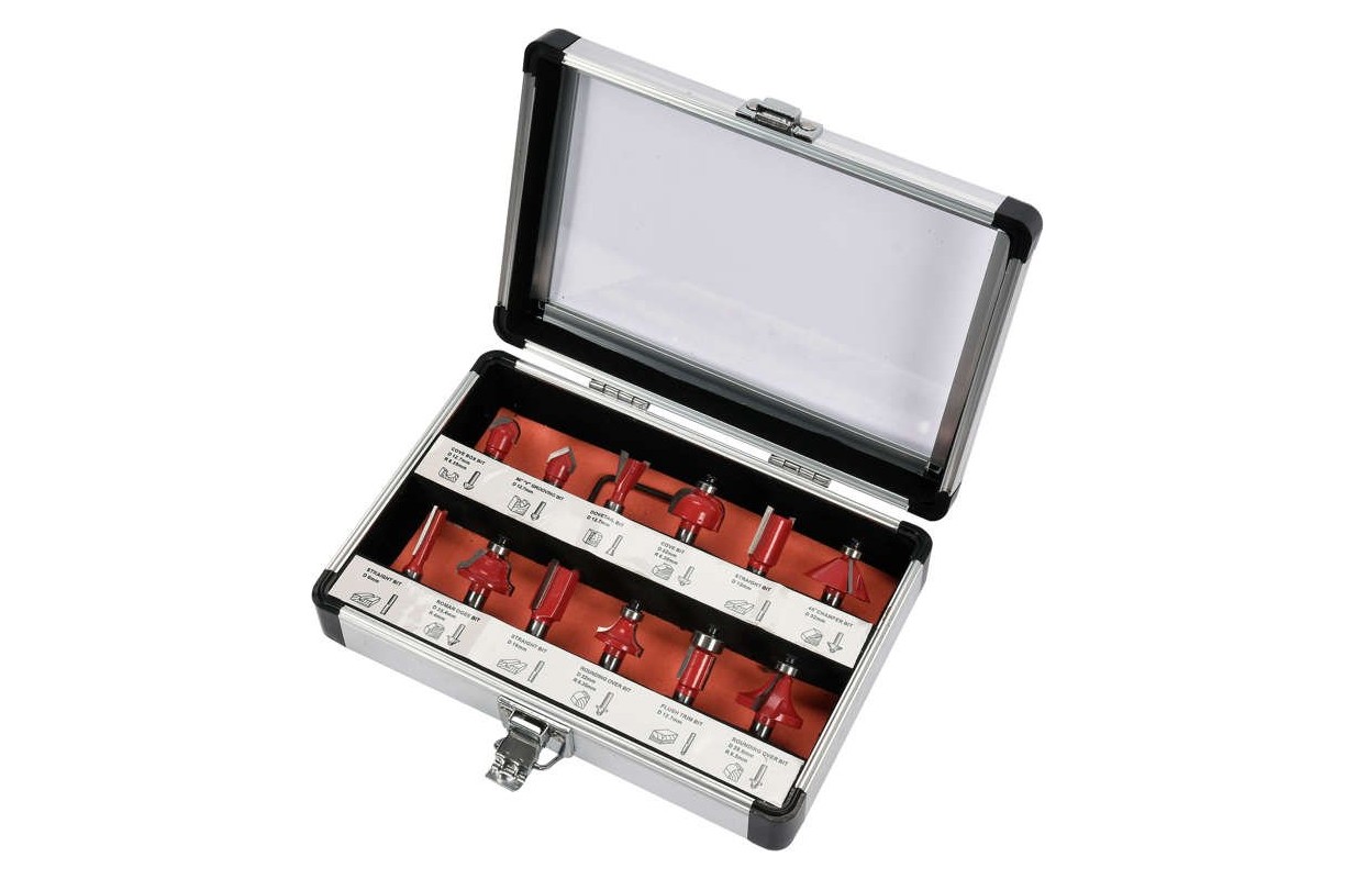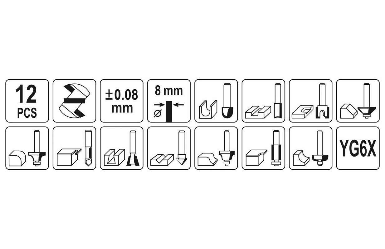 Набор из 12 хвостовиков для деревообработки. Резцы на хвостовике 8 мм, режущие пластины из карбида вольфрама YG6X, в комплект входит шесть резцов с подшипником, облегчающим ведение инструмента. Напаянные серебром резцы, допуск на размеры 0,08 мм.