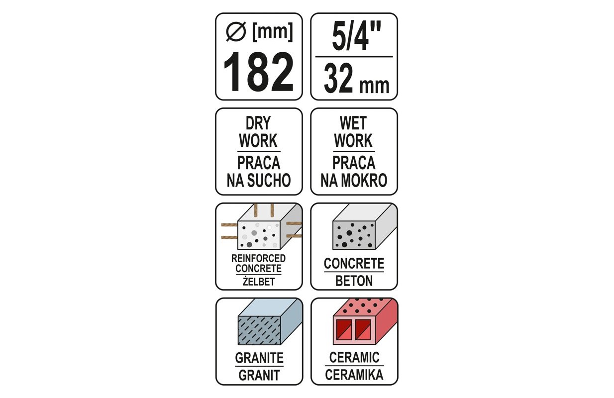 Бур для использования без удара - сухого и влажного - с дрелью (например, YT-81980). Позволяет быстро и точно сверлить отверстия, в том числе без стойки, в железобетоне, бетоне, силикатах, например, под электрические коробки, сверлить потолки для труб и кабелей, прокладывать кабельные трассы или вентиляционные каналы. лазерная сварка сегментов устойчива к перегреву, вызванному резкой арматуры, даже при работе в сухих условиях