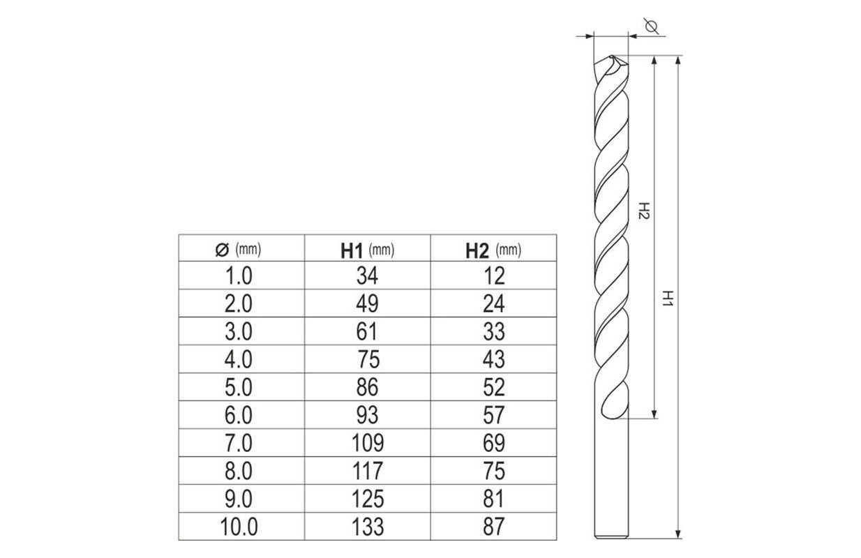 В набор входят 10 сверл диаметром [мм]: 1, 2, 3, 4, 5, 6, 7, 8, 9, 10