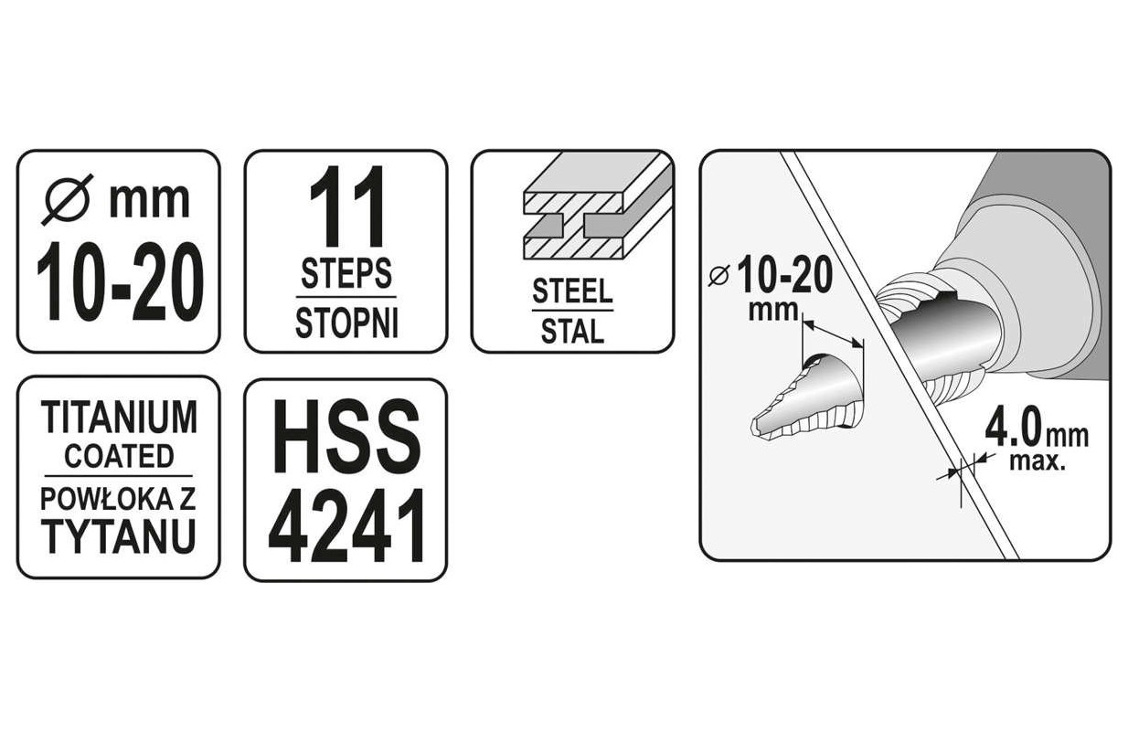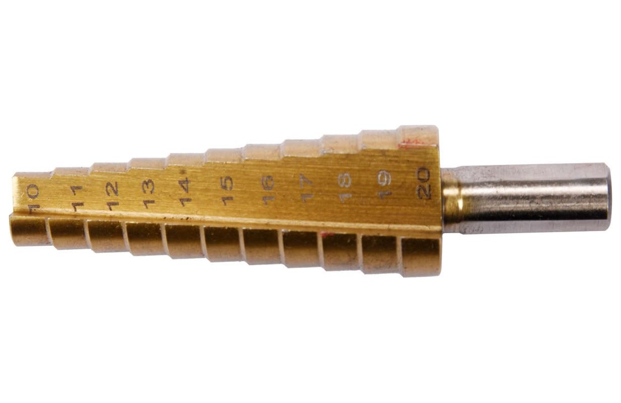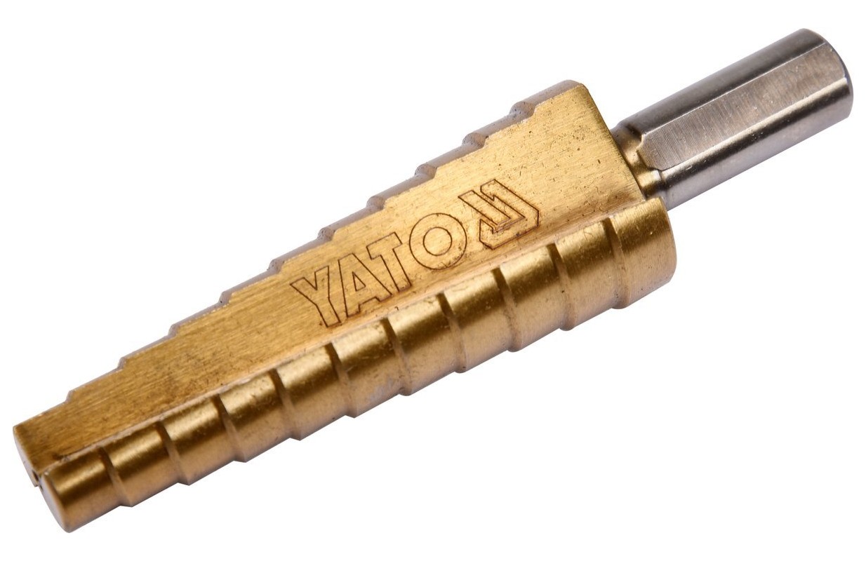 Ступенчатое сверло YATO YT-44745. Предназначены для сверления высококачественной, конструкционной и холоднокатаной нержавеющей стали, цветных металлов, листовой стали, пластика. • изготовлены из быстрорежущей стали HSS 4241, покрыты нитридом титана, что увеличивает срок службы сверл • края просверленного отверстия остаются чистыми и без заусенцев • самоцентрируются на закругленных и скользких поверхностях • быстрый отвод тепла при сверлении твердые материалы • 2 спиральных канавки эффективно удаляют материал • ручка с 3 плоскими поверхностями позволяет передавать максимальный крутящий момент