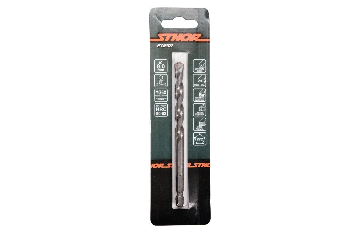 Универсальное сверло с шестигранной рукояткой STHOR 21690. Предназначено для профессионального использования – сверления твердых и необработанных материалов: бетона, нержавеющей и кислотостойкой стали, алюминия, керамики и дерева. • изготовлены из закаленной стали с твердостью 90-92 HRC • лезвия из карбида вольфрама обладают повышенной твердостью и стойкостью к истиранию • шестигранный держатель HEX ¼ʺ для крепления к аккумуляторным шуруповертам и ударным гайковертам.