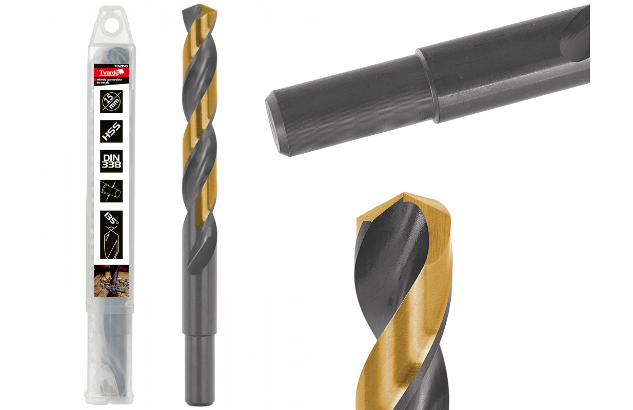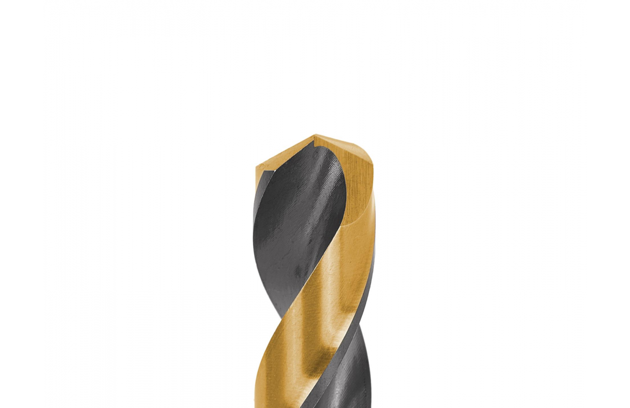 Золотисто-черное точеноесверло по металлу из быстрорежущей стали 4341 HSS, покрытое TiN (нитрид титана). Сверло в соответствии с DIN 338. Цилиндрический, катаный патрон, что позволяет использовать сверло с большим диаметром, чем диапазон сверлильного патрона.