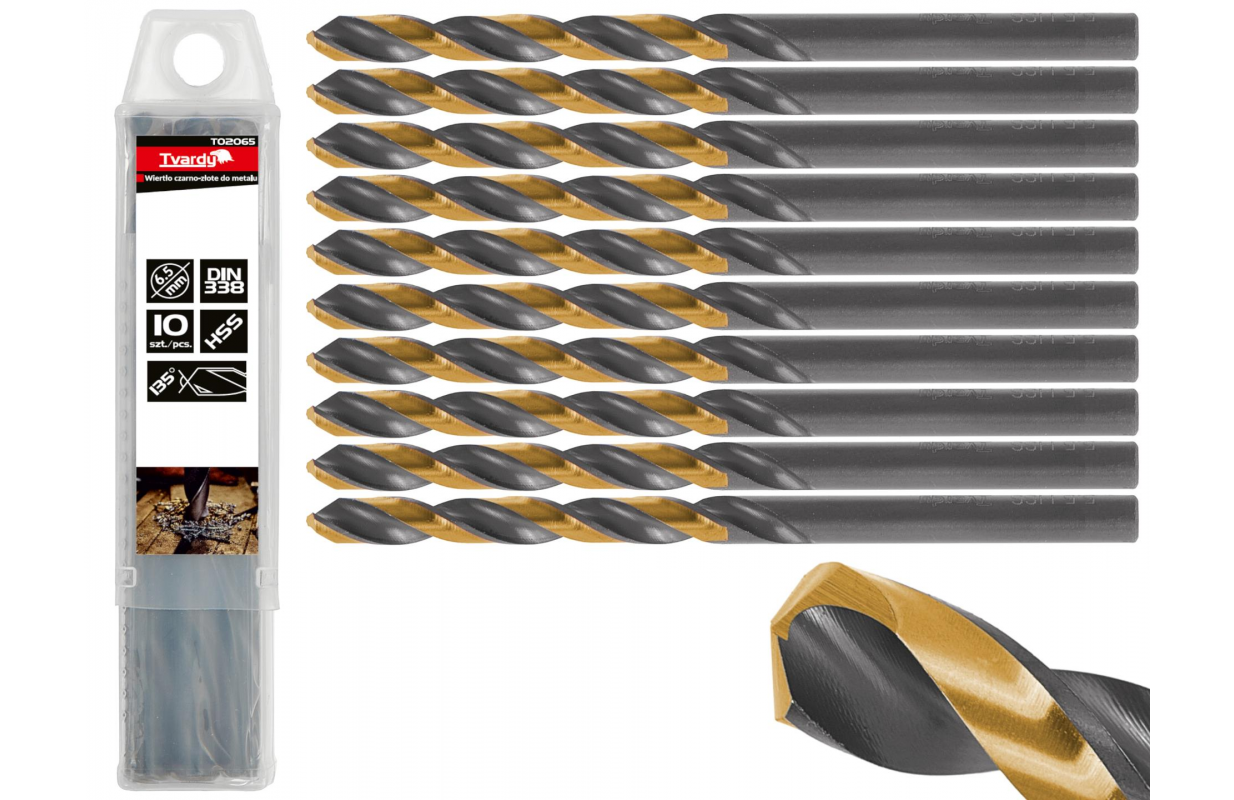 Золотисто-черные металлические сверлаиз быстрорежущей стали 4341 HSS, покрытые TiN (нитрид титана). Сверла в соответствии с DIN 338. Ручка цилиндрическая.