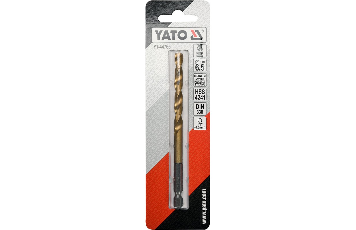 Сверло с металлическим титановым покрытием с шестигранным держателем YATO YT-44765. Изготовлен из быстрорежущей стали HSS, покрыт титановым покрытием. Точка разделения позволяет сверлить без предварительной разметки. Кромки сверла отшлифованы. Угол прицеливания 135 градусов. Они быстро рассеивают тепло при сверлении твердых сортов стали, не обжигая сверла. Предназначен для профессионального использования при сверлении высококачественной нержавеющей стали, конструкционной стали и холоднокатаного проката.
