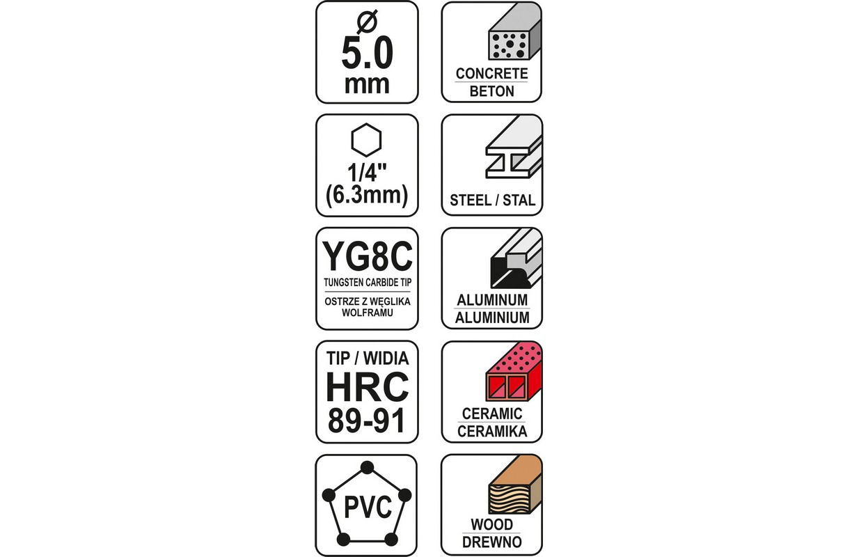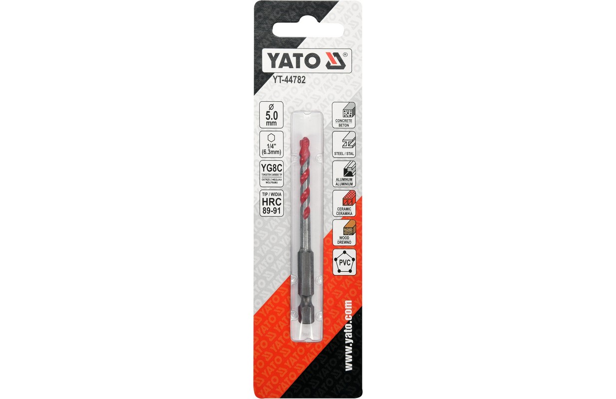 Универсальное сверло YATO YT-44782. Универсальное сверло, которое благодаря специальной конструкции спирали позволяет сверлить практически все материалы - металл, бетон, алюминий, керамику, дерево и пластик. - Твердосплавное лезвие YG6X с твердостью 89-91 HRC - Корпус сверла с твердостью 42-45 HRC - Спиральная геометрия ускоряет удаление обломков - Эффективное, долговечное и устойчивое к повреждениям и затуплению - Шестигранная рукоятка HEX 1/4ʺ (6,3 мм) обеспечивает крепление для аккумуляторных шуруповертов и гайковертов.