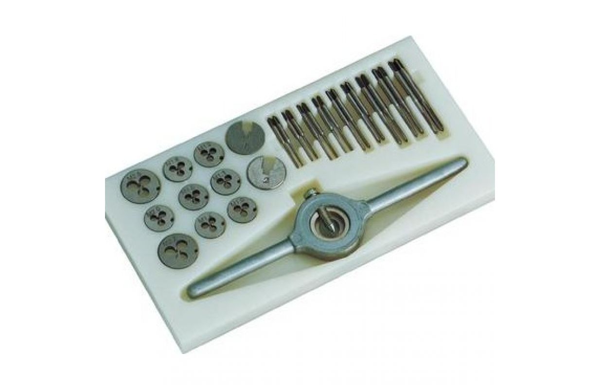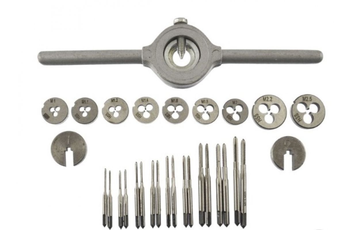 Содержит 9 разводных плашек M1, 1.1, 1.2, 1.4, 1.6, 1.8, 2, 2.2, 2.5. ручные метчики 18шт