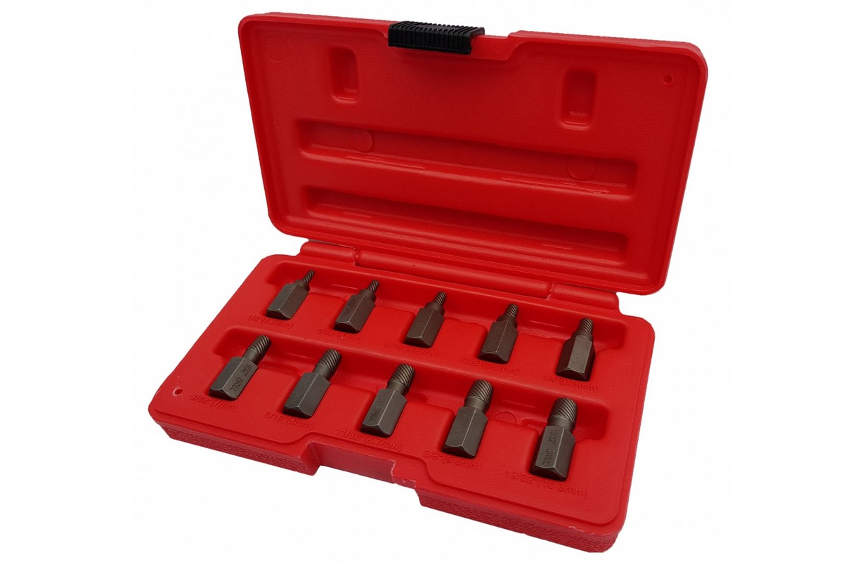 НАБОР ИЗ 10 ВИНТОВЫХ ЭКСТРАКТОРОВ С ШЕСТИГРАННОЙ ГОЛОВКОЙ МНОГОШЛИЦЕВЫЕ ЭКСТРАКТОРЫ ДЛЯ УДАЛЕНИЯ ОБЛОМАННЫХ ШПИЛЬОК, ТРУБ, УСТАНОВОЧНЫХ ВИНТОВ, АЛЕМИТОВЫХ ФИТИНГОВ И Т. Д. ПОДХОДИТ ДЛЯ НАИБОЛЕЕ ШИРОКО ИСПОЛЬЗУЕМЫХ РАЗМЕРОВ ОТ 1/8" ДО 7/8" МОЖЕТ ИСПОЛЬЗОВАТЬ С РУЧНЫМИ ГОЛОВКАМИ И КЛЮЧАМИ СОДЕРЖИТ РАЗМЕРЫ ОТ ОТ 1/8 ДЮЙМА ДО 13/32 ДЮЙМА С ШАГОМ 1/32 ДЮЙМА, 40CR, JRC50-55