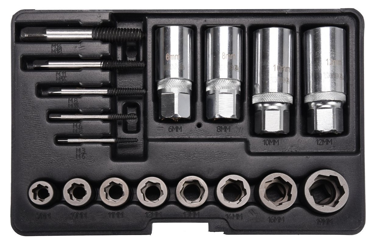 Универсальный набор экстракторов из 17 предметов для откручивания винтов и торцевых головок. Рекомендуется для механических и автомобильных сервисов.